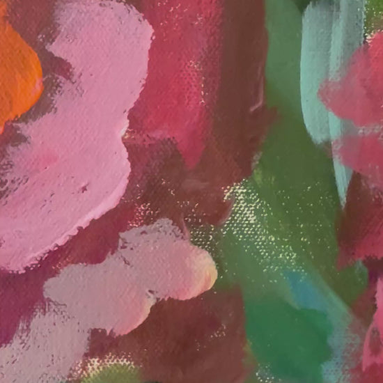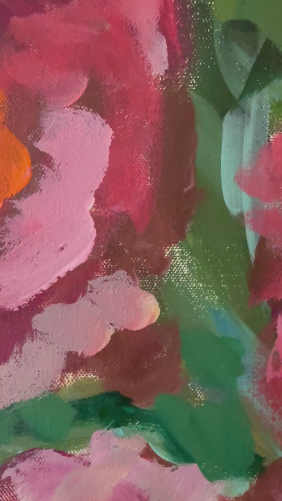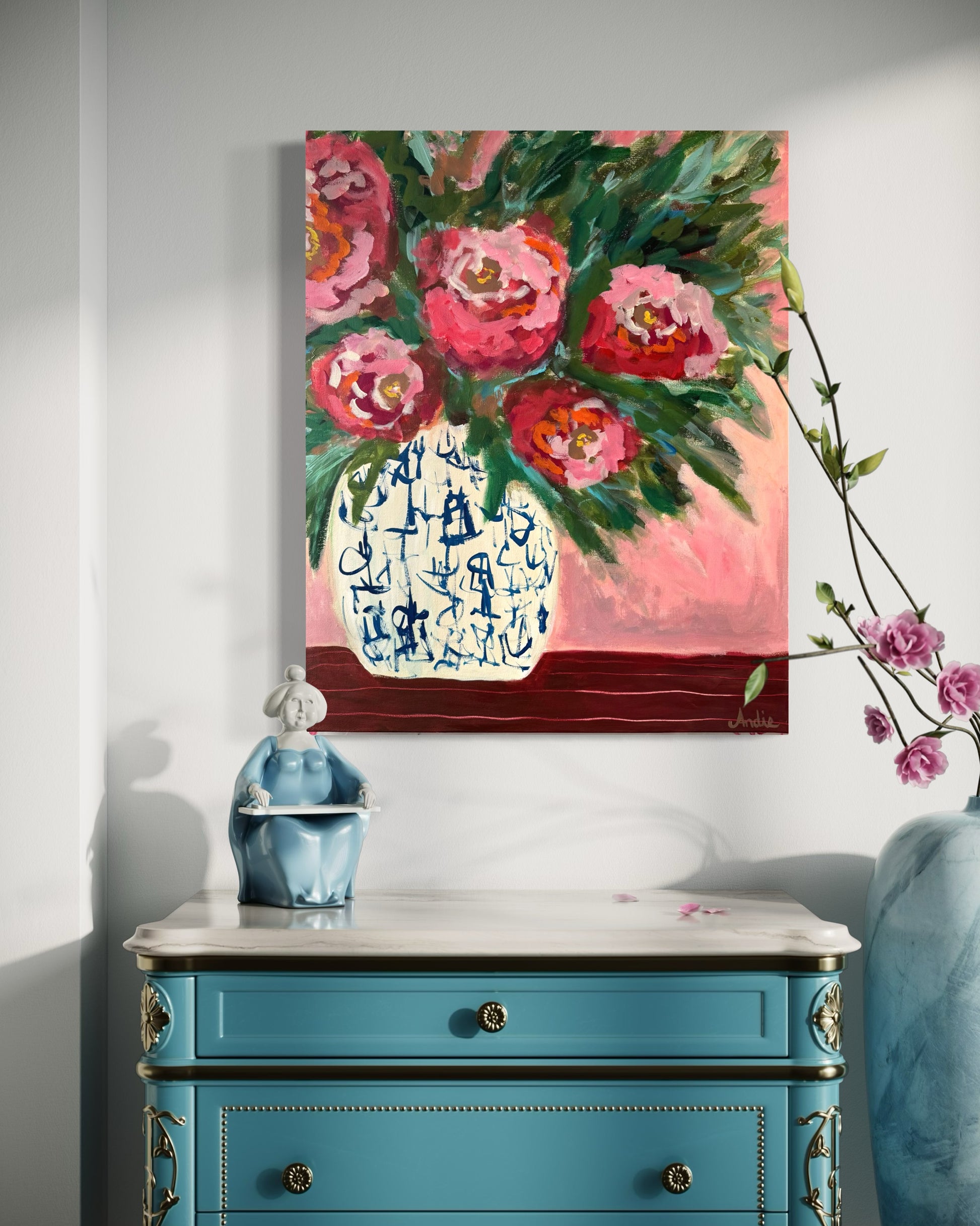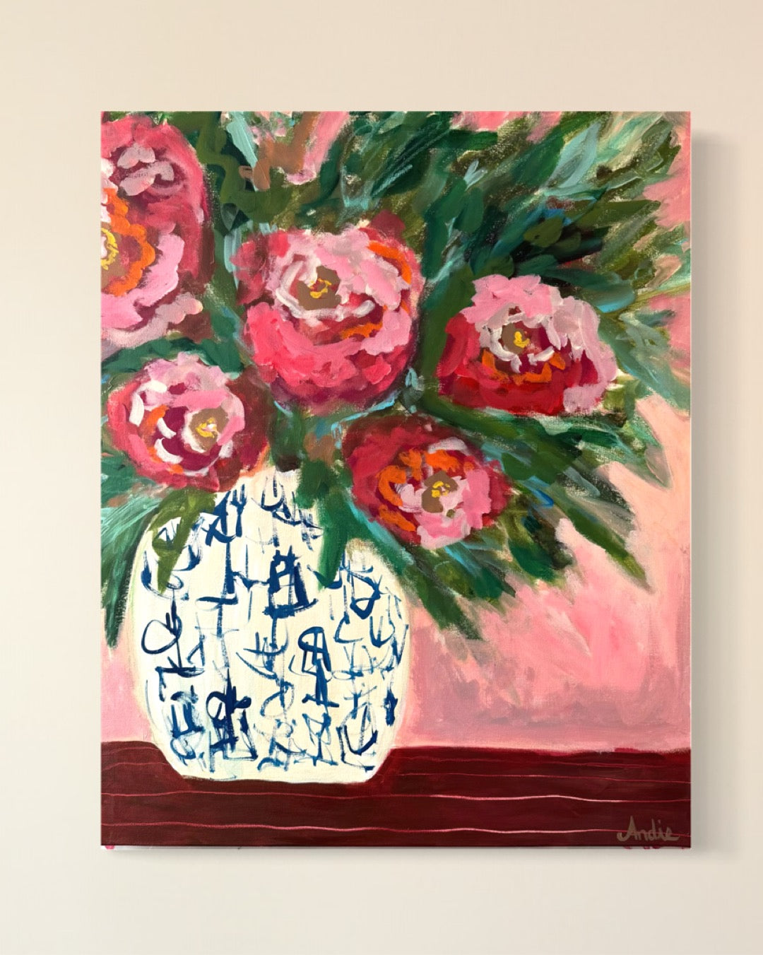Big blooms, bold strokes, and a whole lot of feeling—this one’s got heart. “A Little Piece of My Heart” is a vibrant floral still life filled with motion and color. The bright pink and coral flowers spill out of a patterned vase, full of texture and personality, set against a soft pink background that adds warmth and depth.