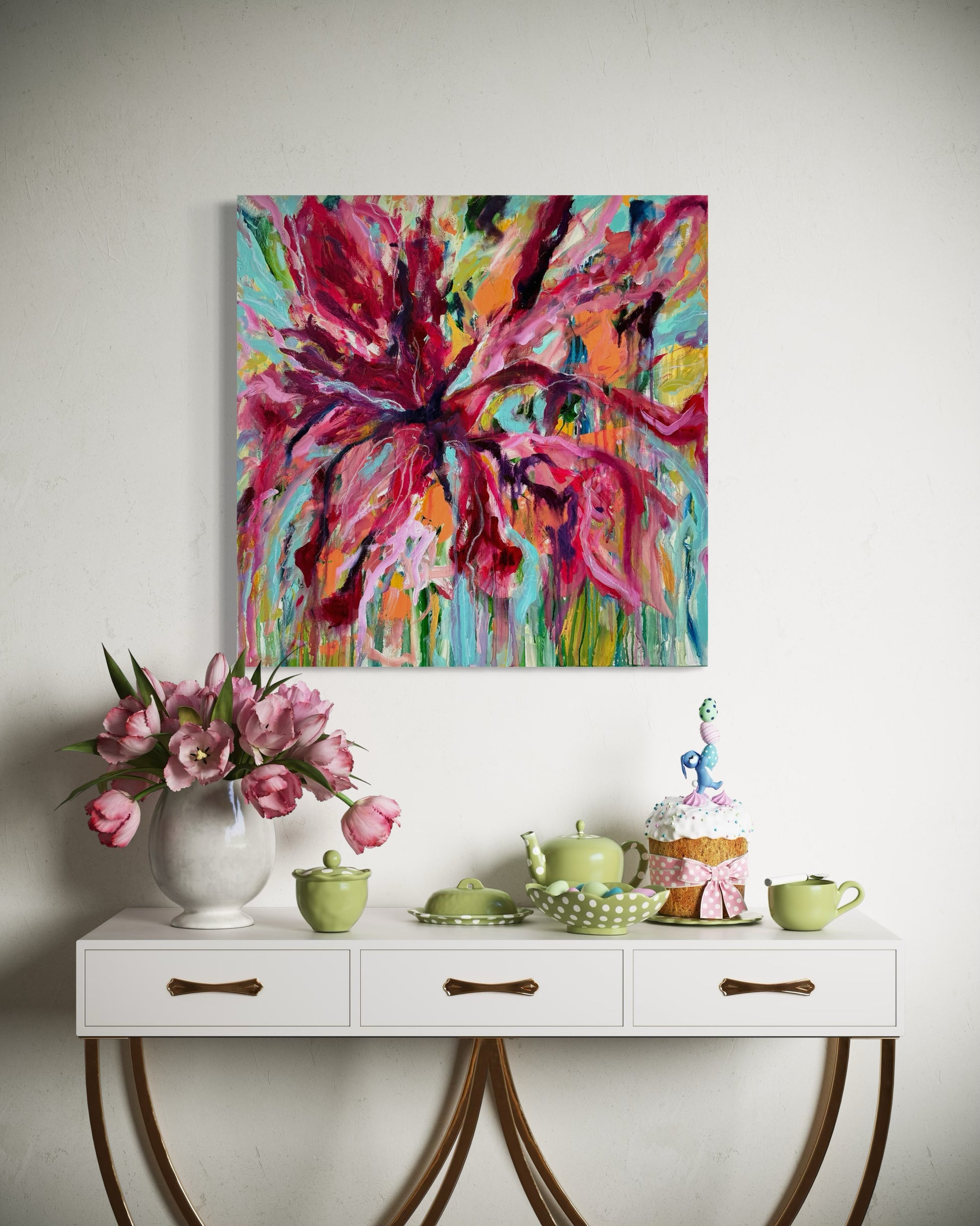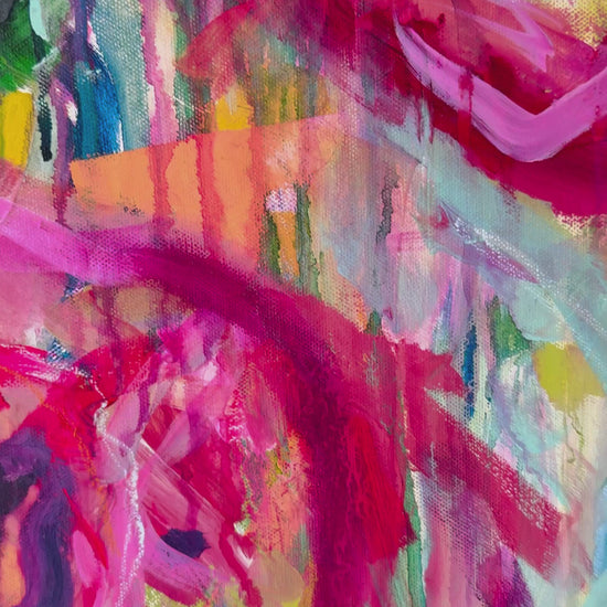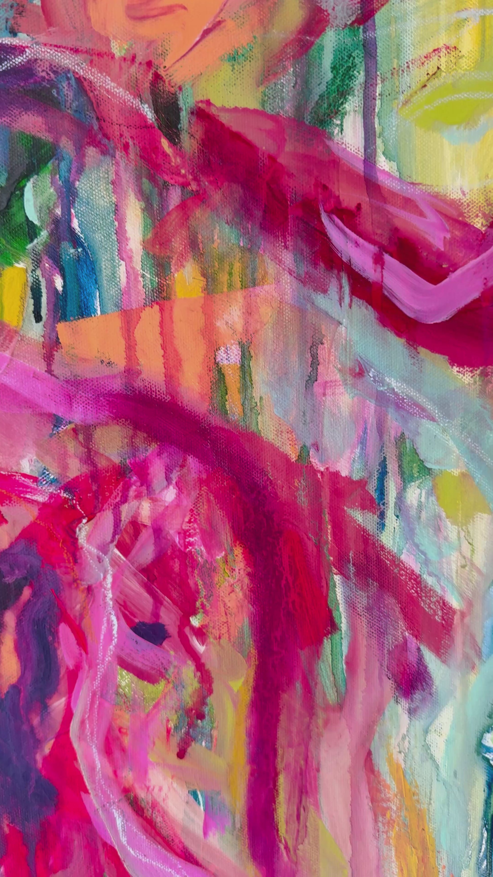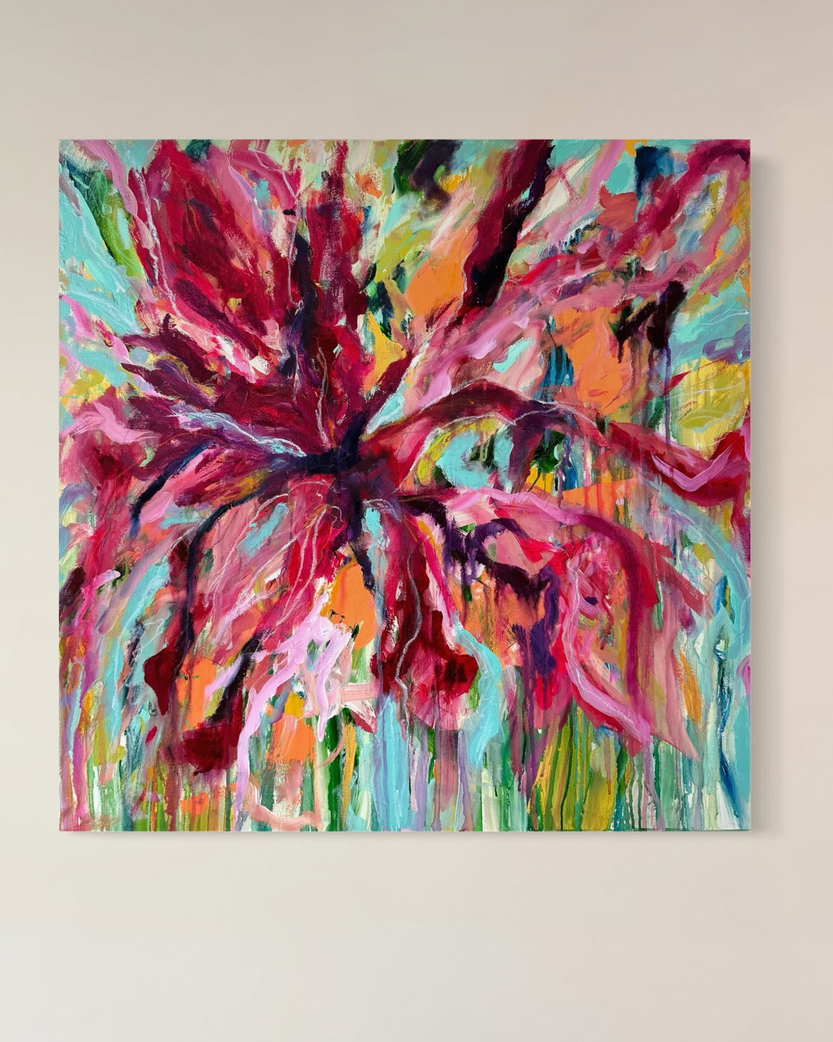 Inspired by the melancholy beauty of connection and distance, Fade Into You drips with deep reds, soft teals and coral tones. Movement and contrast are created with acrylics, clay paints, and pencil. This piece will bring a bold energy to any space.