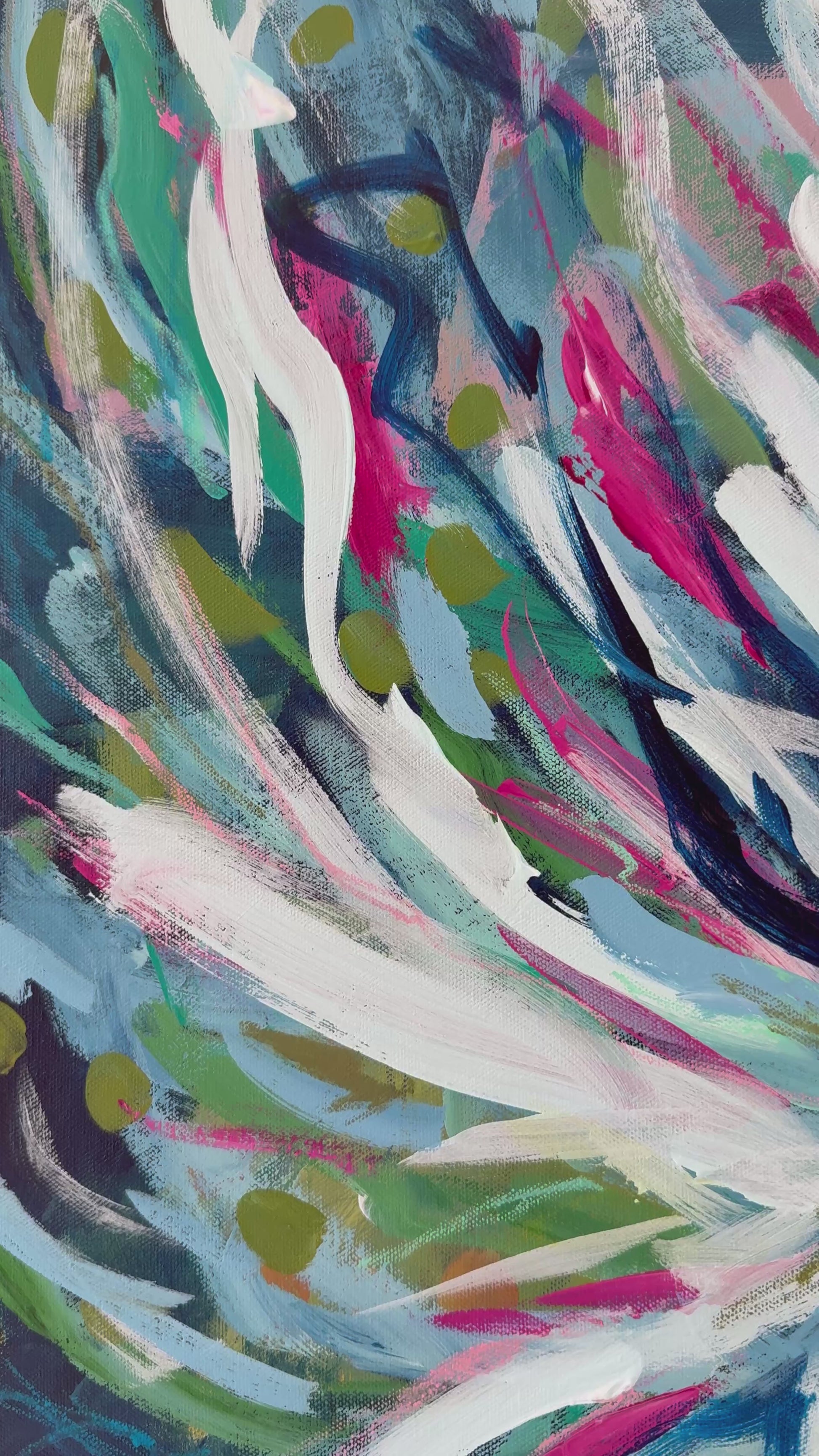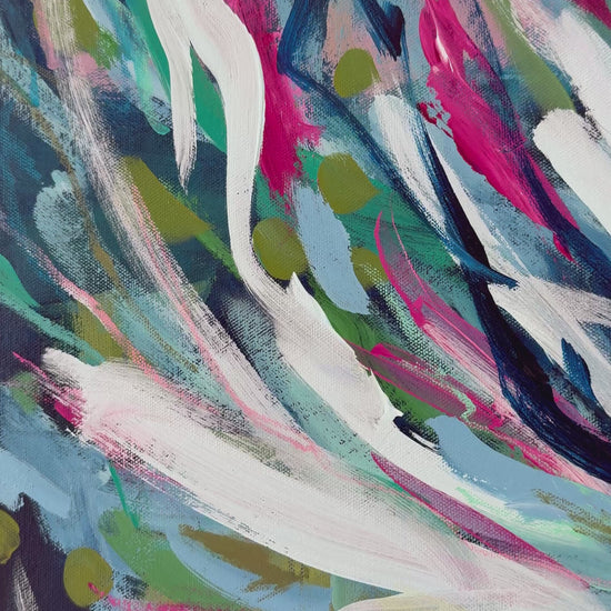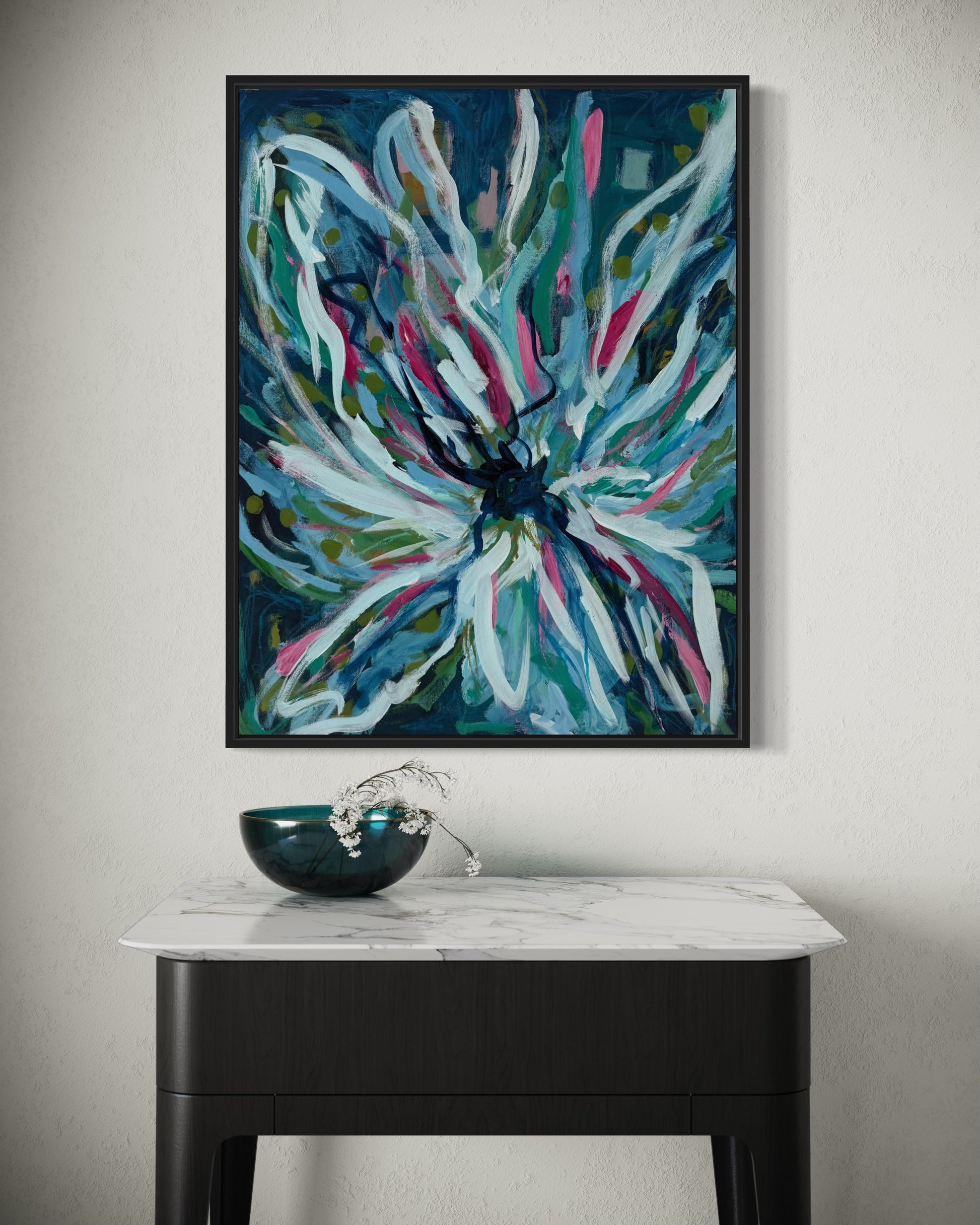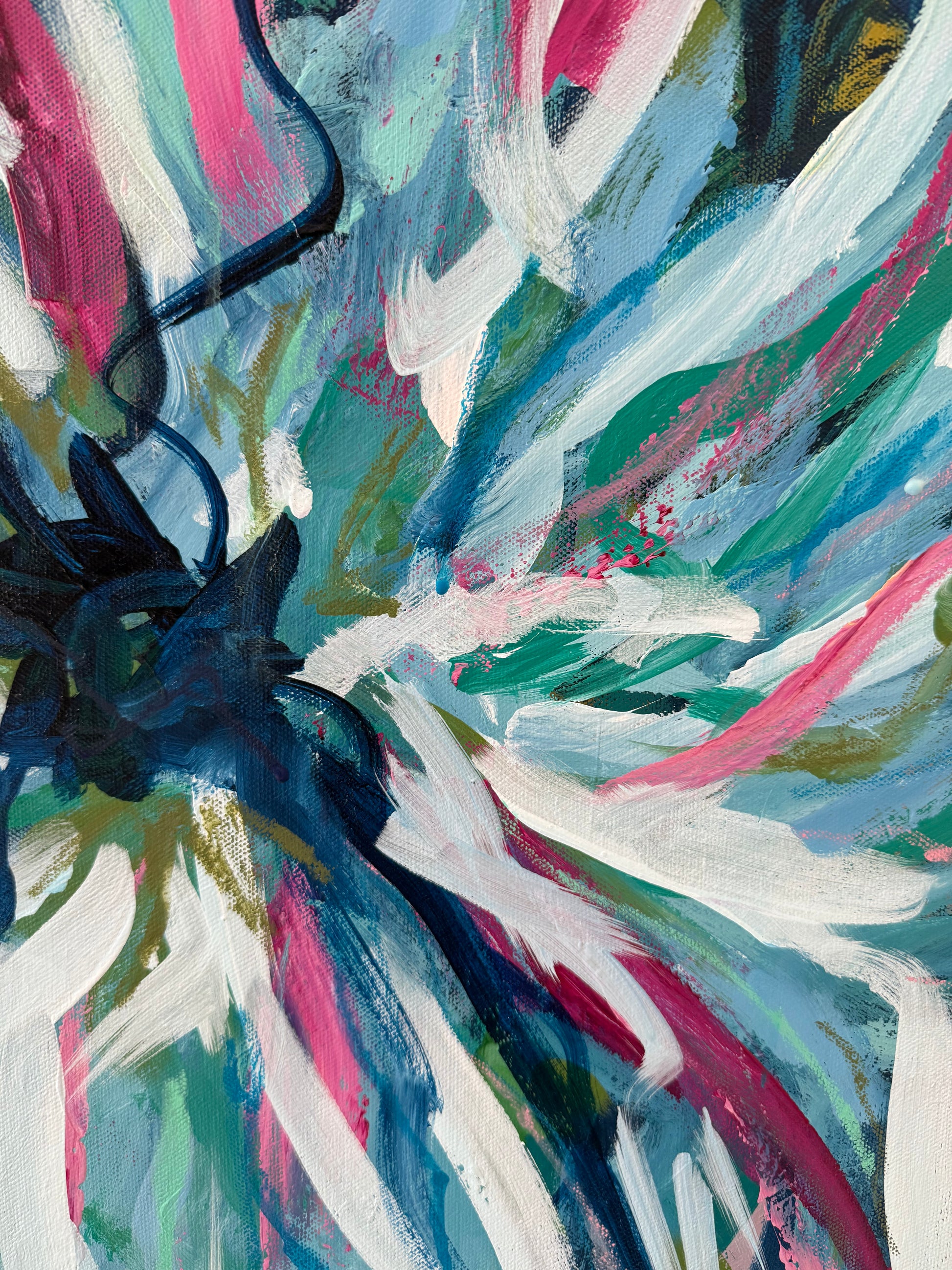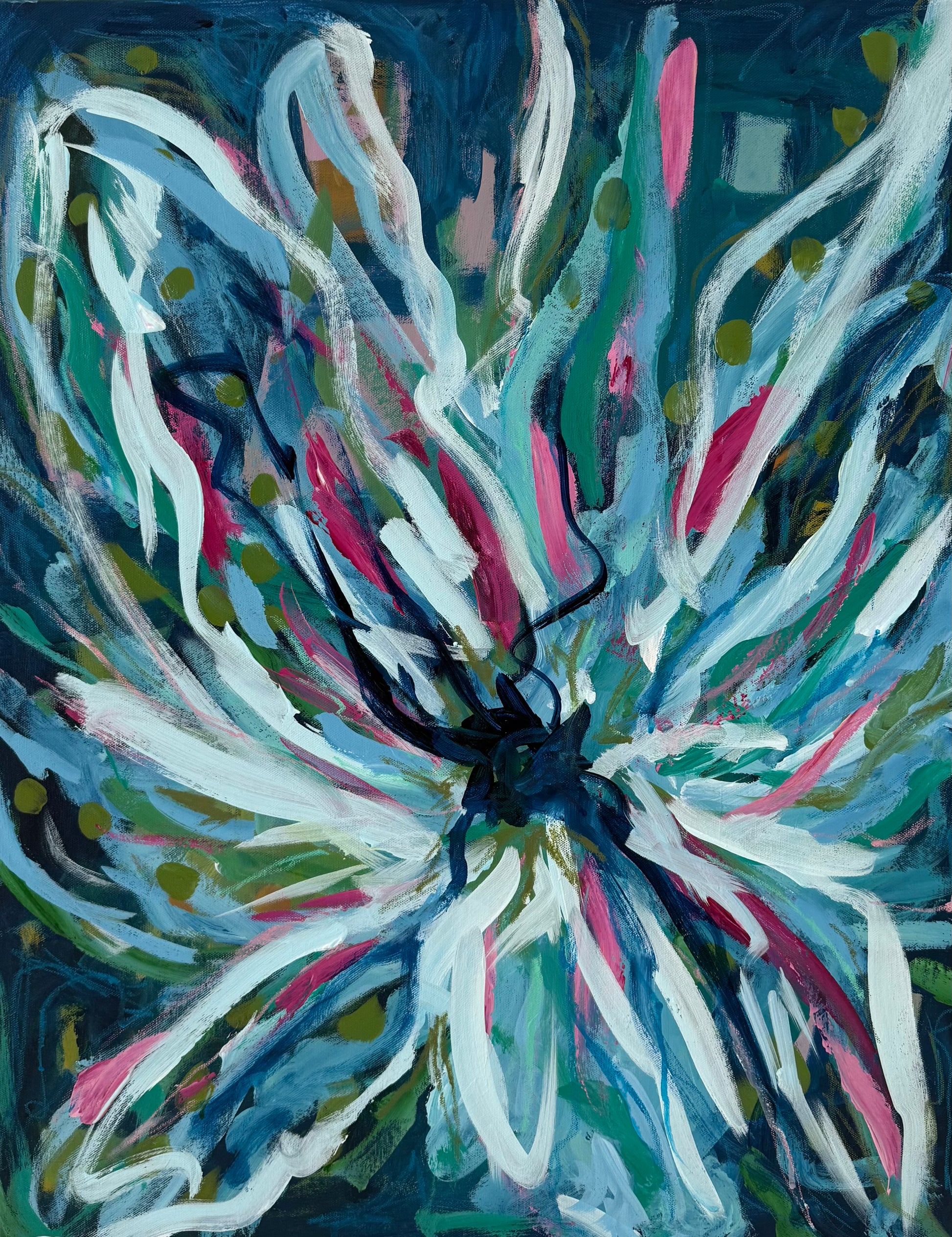Moondance captures the energy of a night sky in motion. Layers of teal, cobalt, white, and magenta rise and twist like petals catching moonlight in a breeze. This mixed media piece is a celebration of intuition, rhythm, and the magic found in dancing with the one you love.