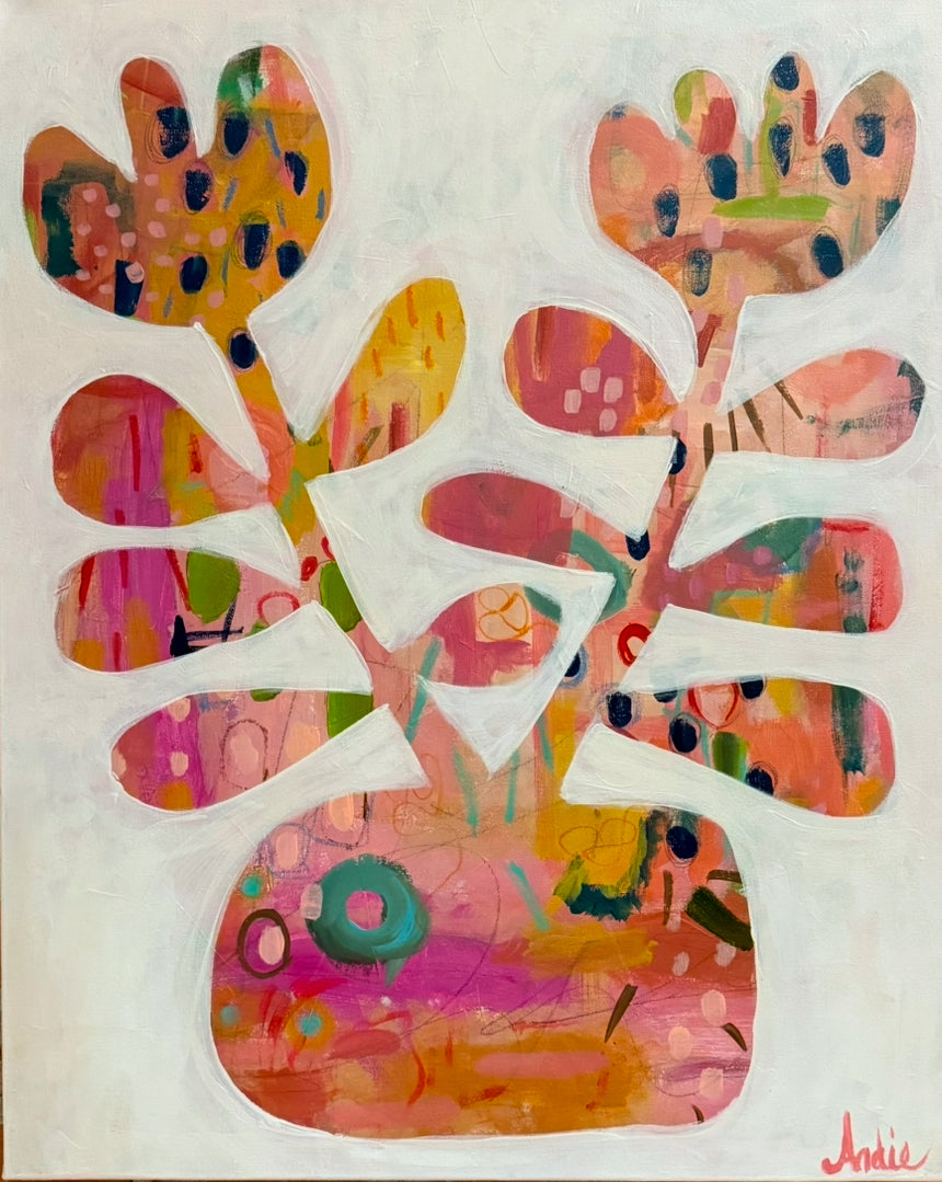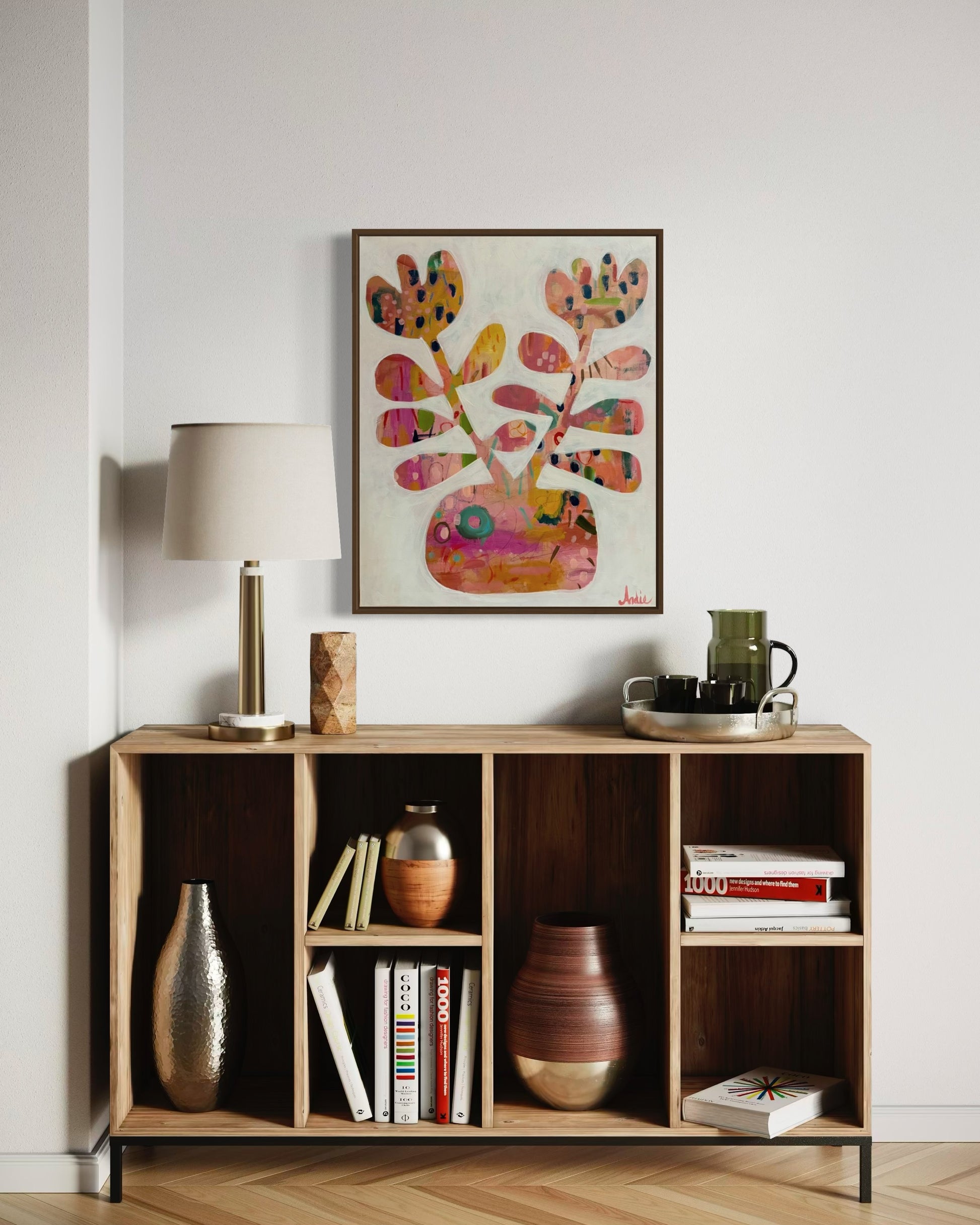 I and Love and You is a joyful and heartfelt abstract botanical that celebrates connection in all its vibrant forms. Layers of bold pinks, sunny yellows, deep blues, and playful marks peek through a crisp white silhouette, creating a striking balance between chaos and calm. Every brushstroke tells part of the story of love given, love received, and love that simply exists. This uplifting piece adds warmth, personality, and a pop of color to any space.