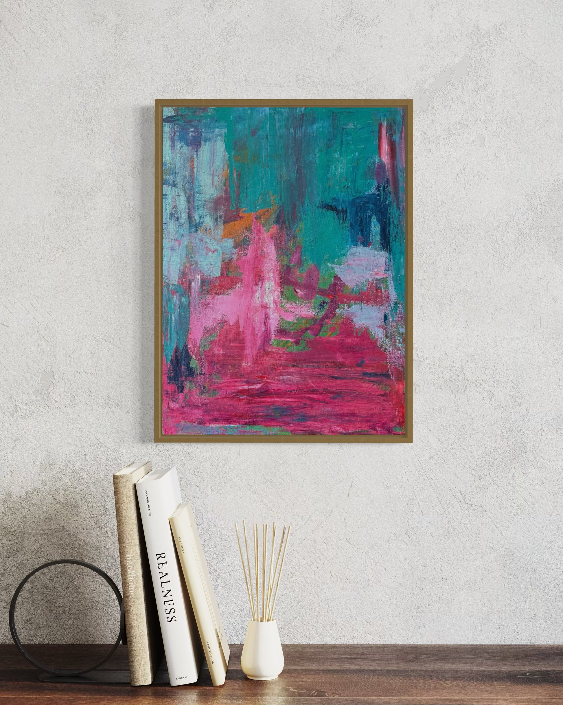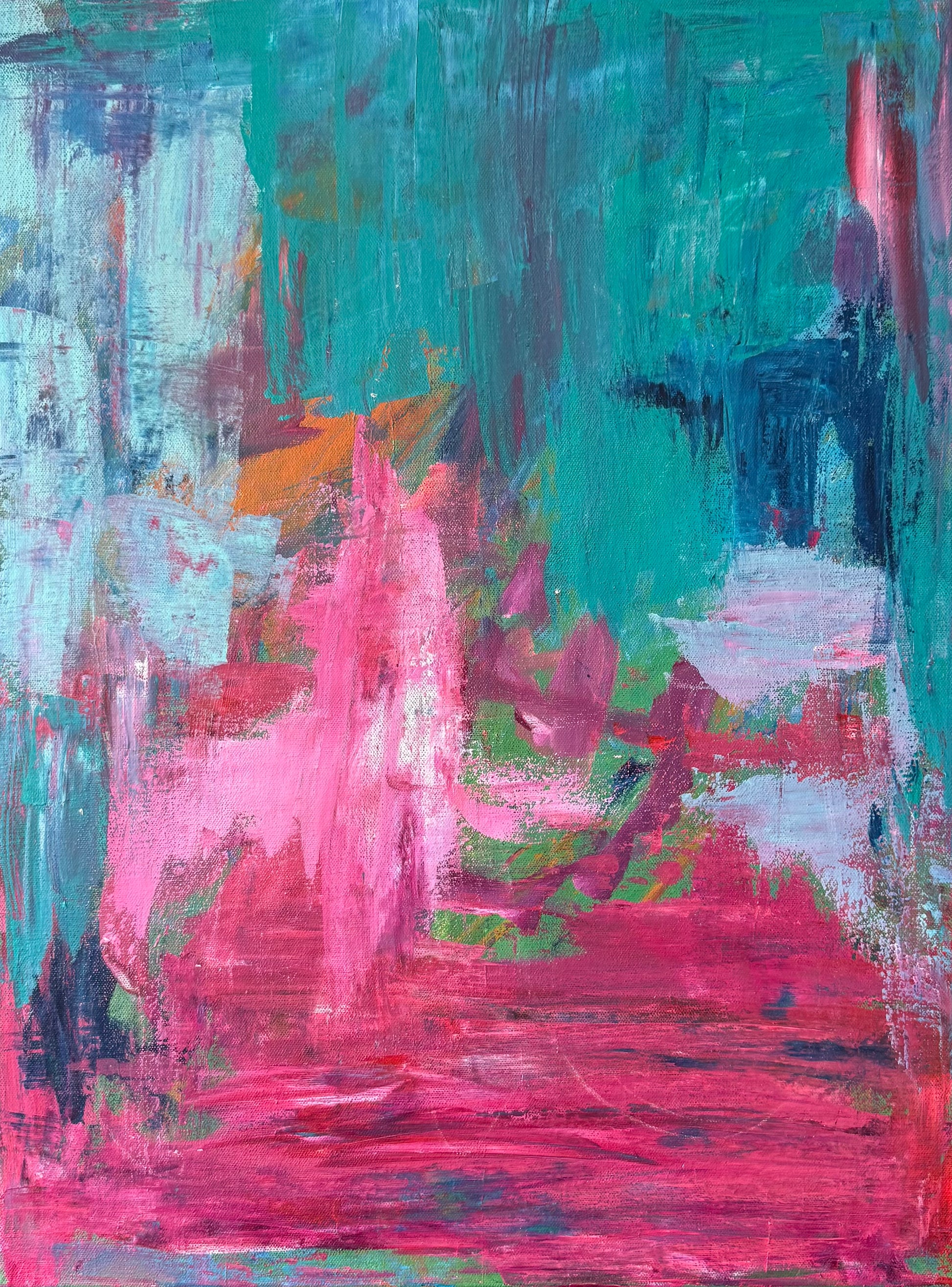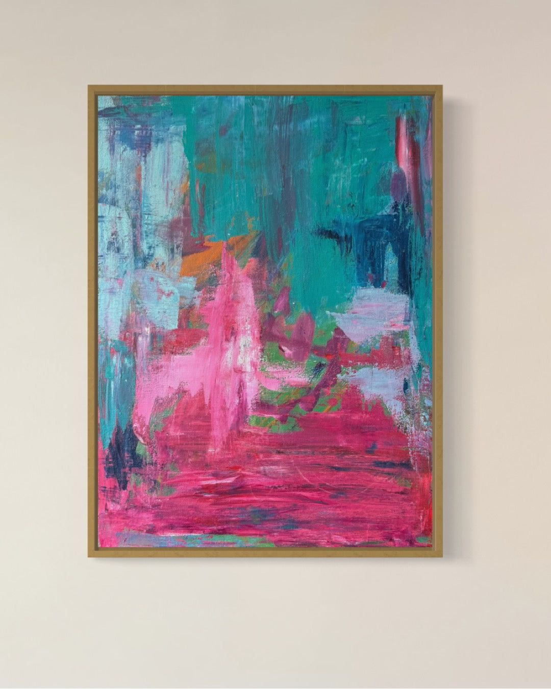 This piece was inspired by summer storms rolling in over the pink sand beaches of the Bahamas. The bold pinks and moody teals reflect that mix of calm and chaos you feel when the sky shifts and the air gets heavy. It’s all about that dreamy, in-between moment right before the rain hits and everything feels electric.