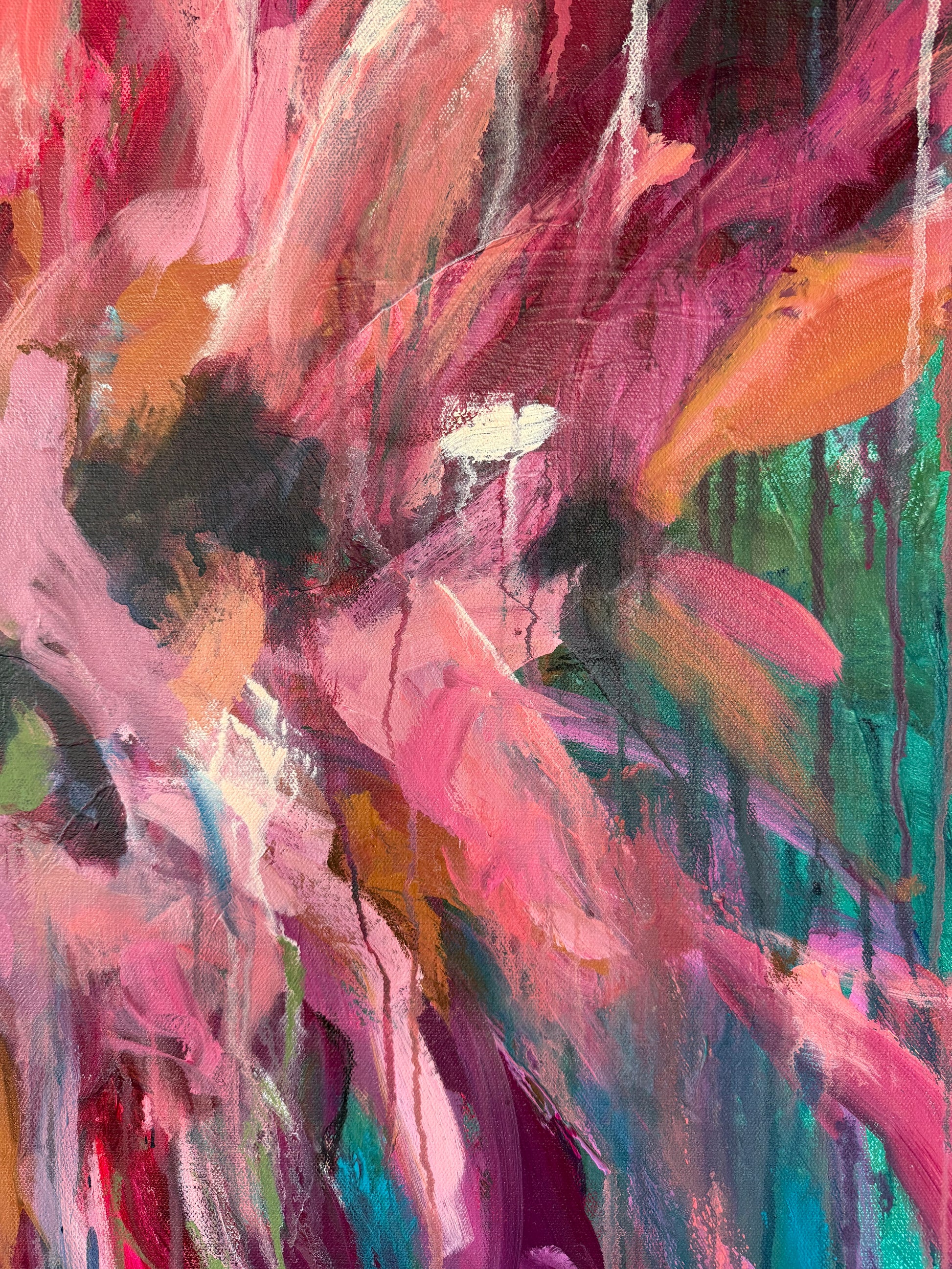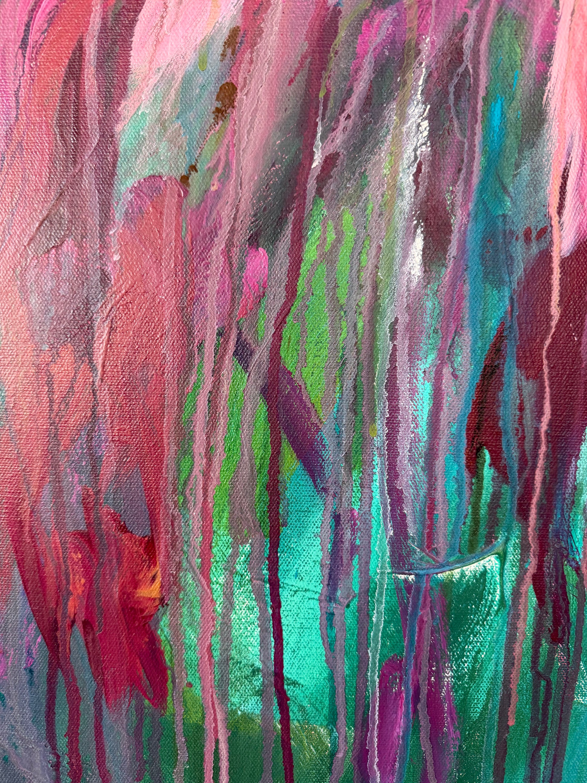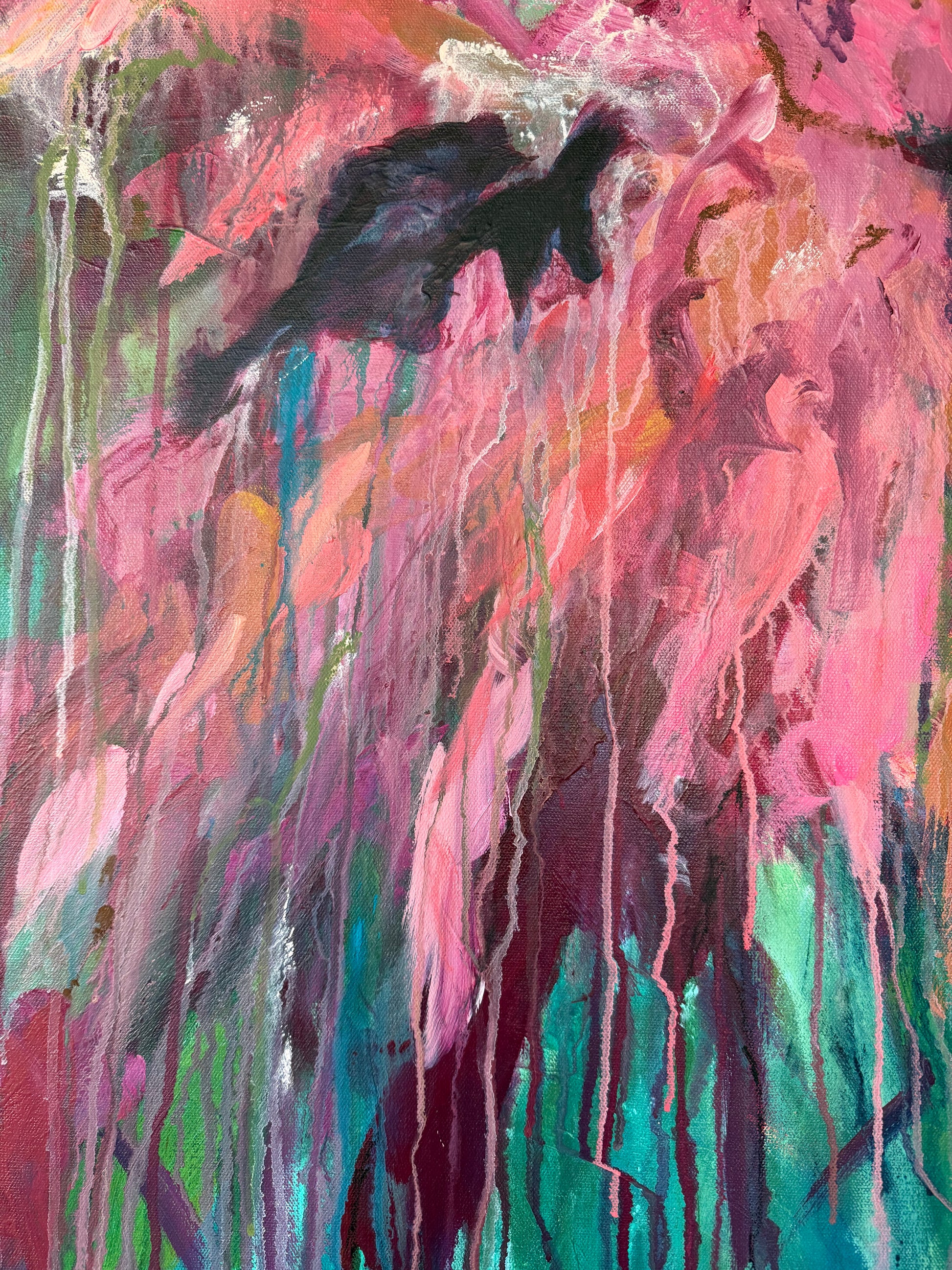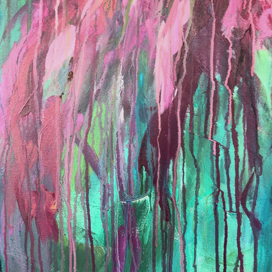 Bold washes of pink and coral surge forward like a release, layered over deep greens and blues that feel grounding. Drips and movement are left visible, honoring the process rather than hiding it.