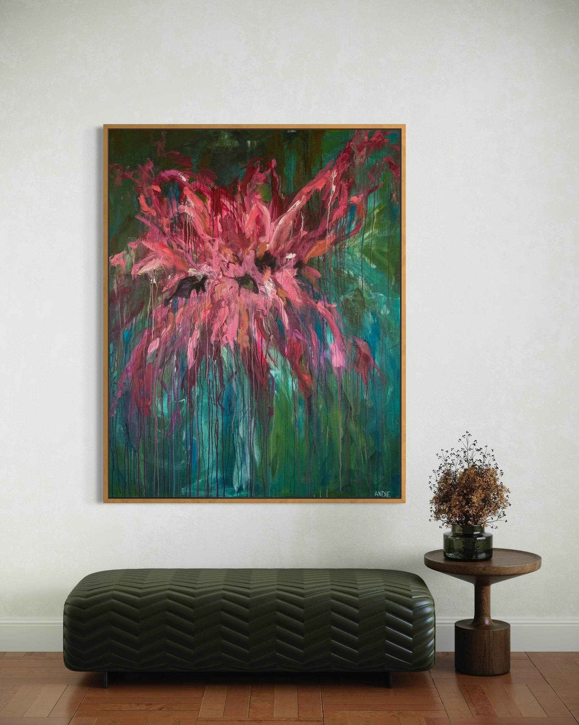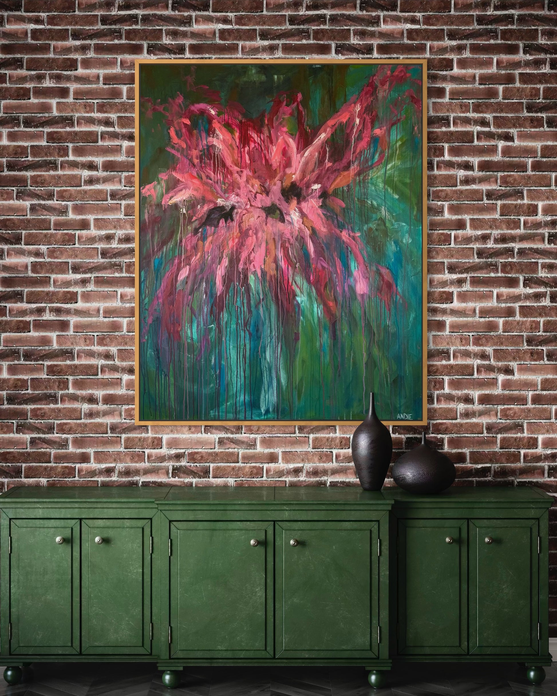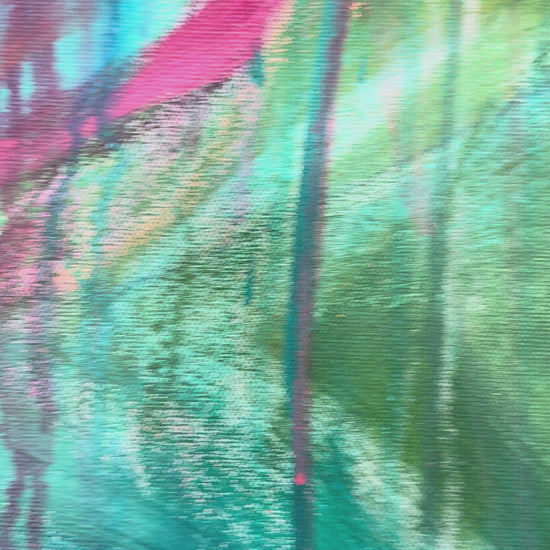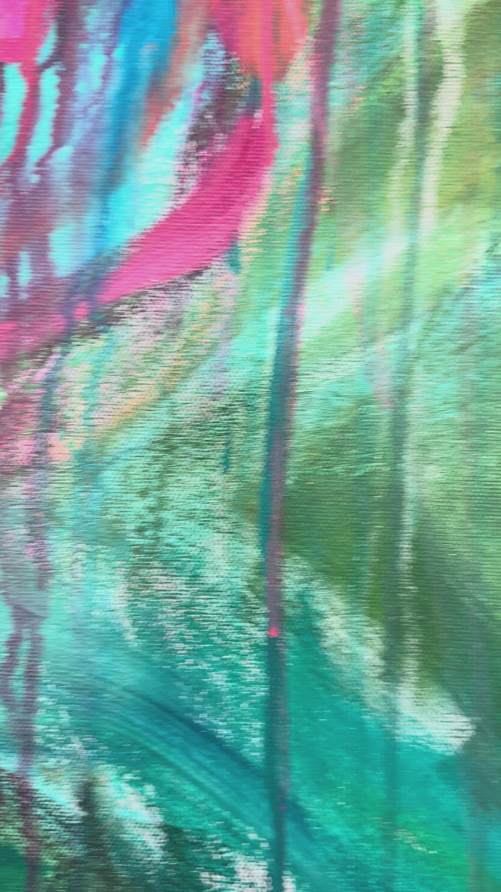 Bold washes of pink and coral surge forward like a release, layered over deep greens and blues that feel grounding. Drips and movement are left visible, honoring the process rather than hiding it.