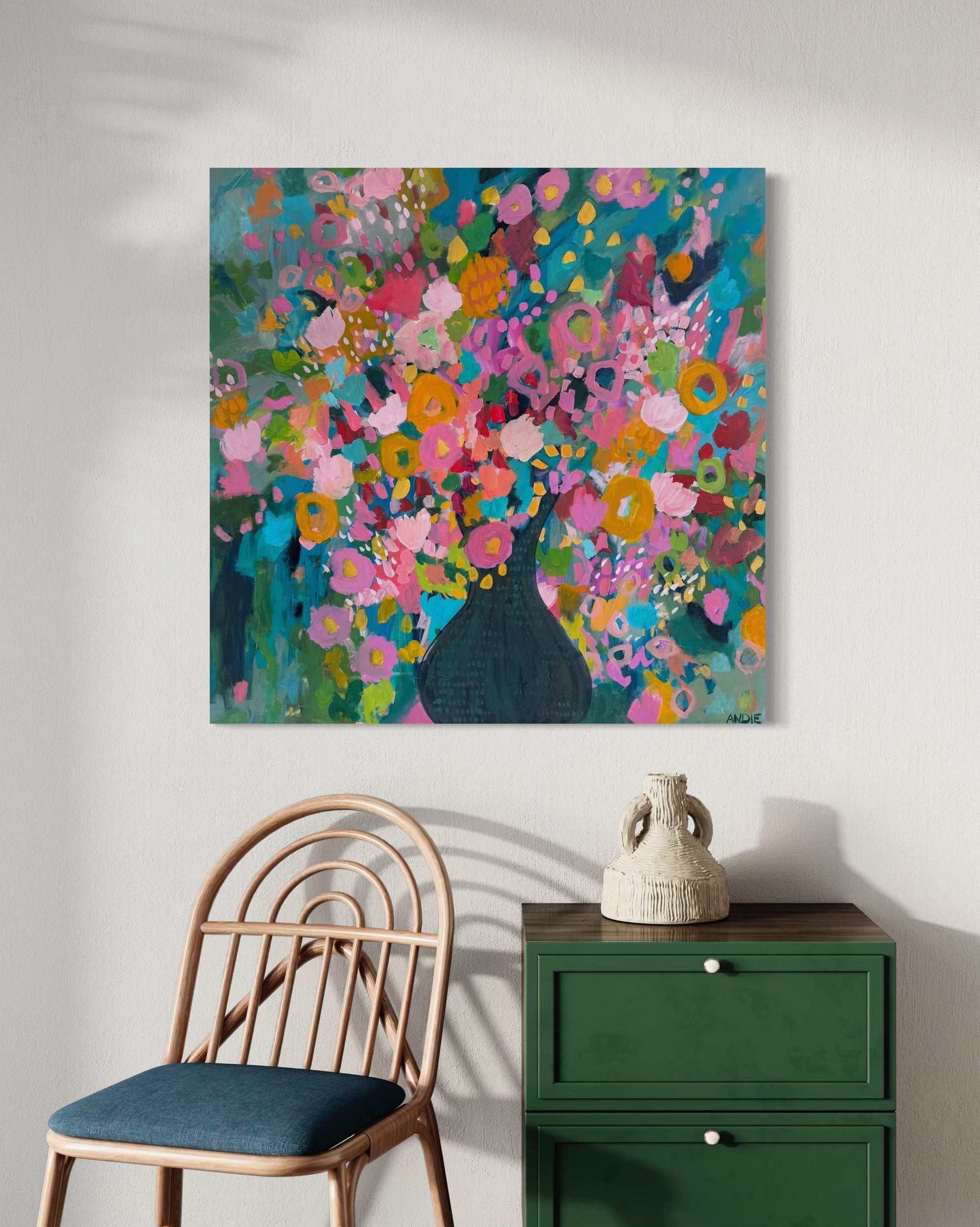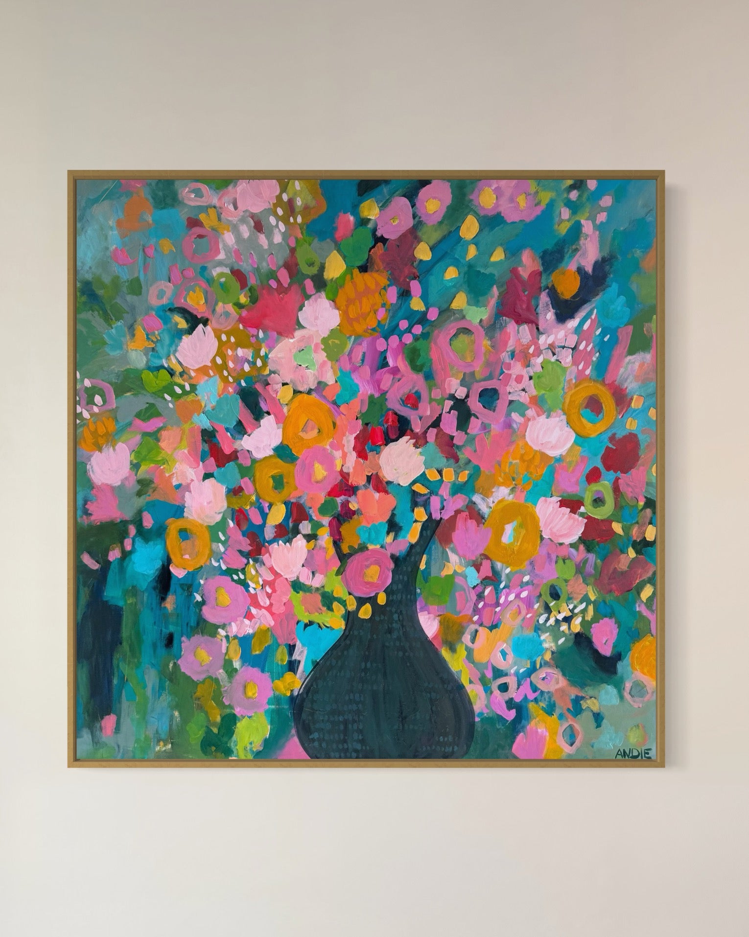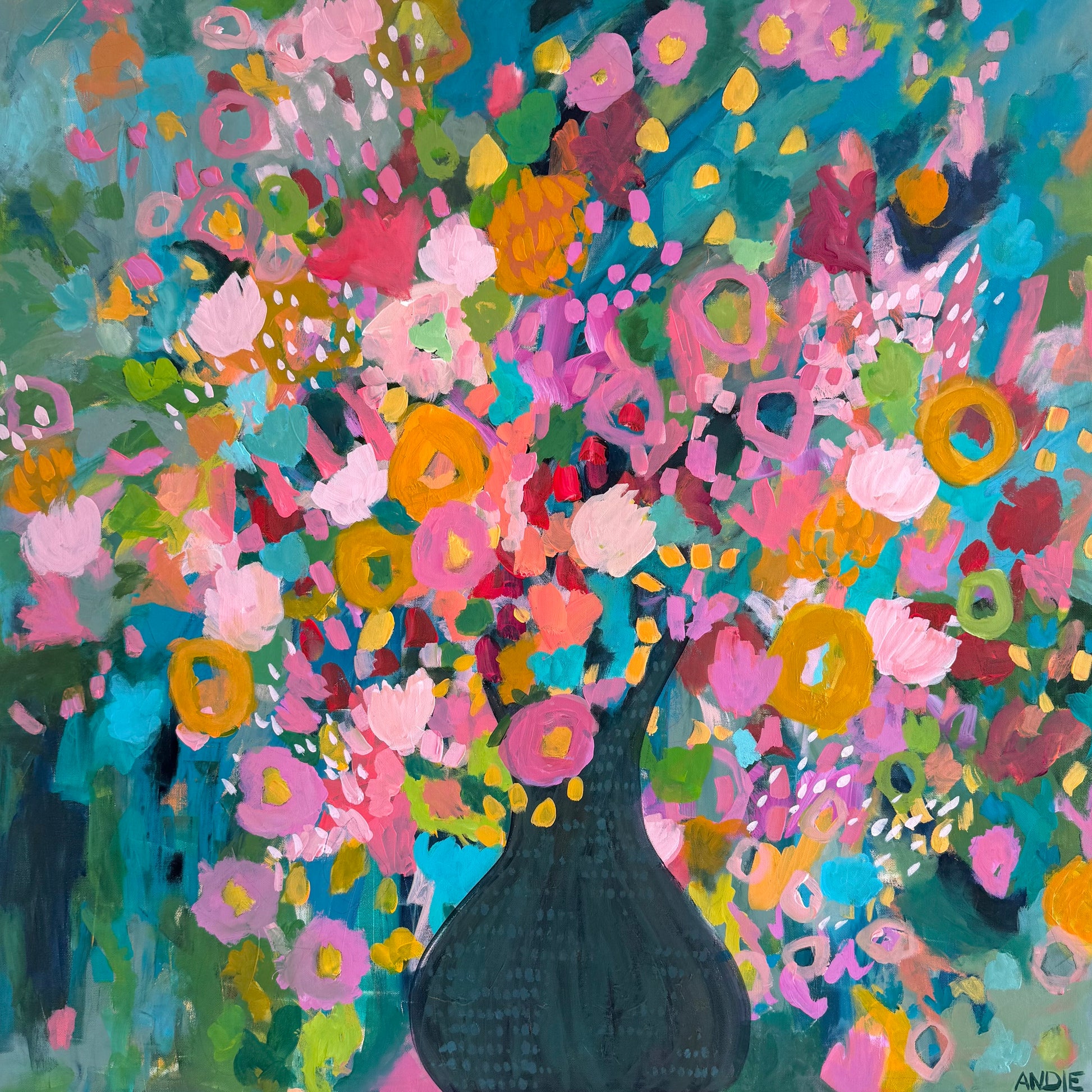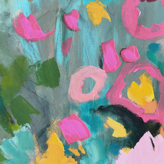“Love You Madly” is pure joy on canvas. It bursts with vibrant color and energy. Bold pinks, sunny yellows, and pops of turquoise come together in a playful, free-spirited way that feels both wild and intentional. It’s a celebration of love in its brightest, happiest form. Are you ready for a little wild romance?