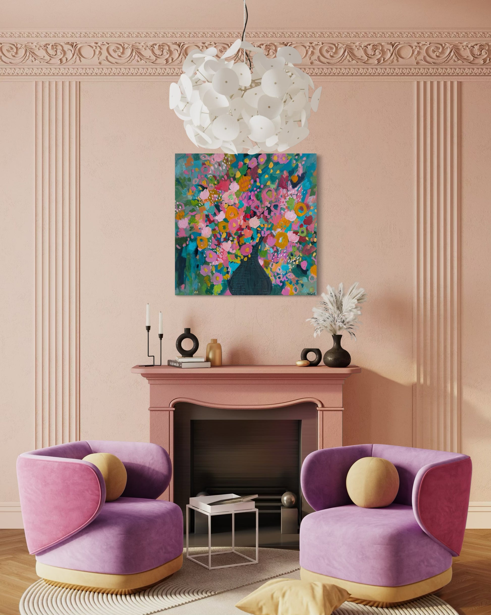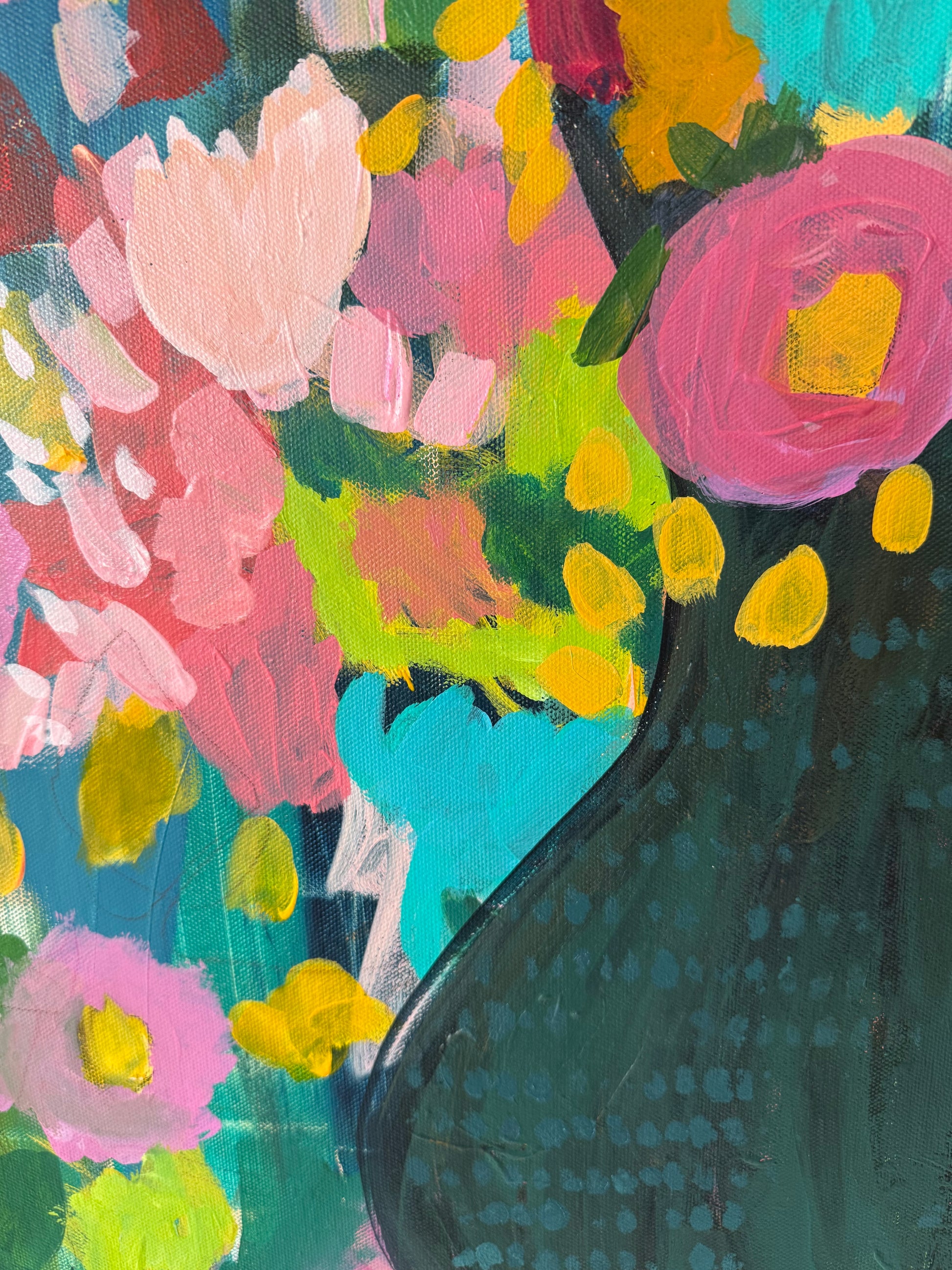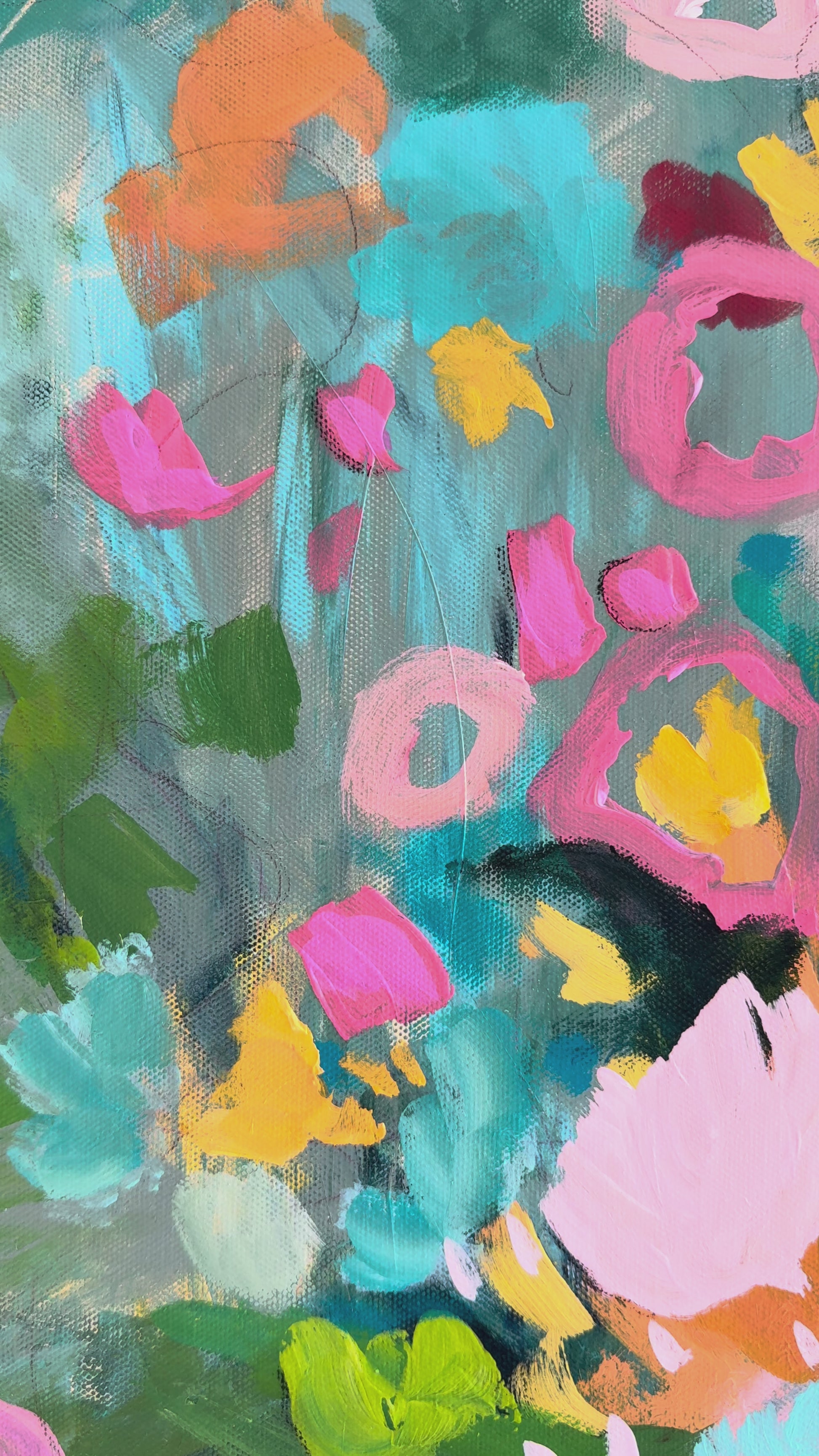 “Love You Madly” is pure joy on canvas. It bursts with vibrant color and energy. Bold pinks, sunny yellows, and pops of turquoise come together in a playful, free-spirited way that feels both wild and intentional. It’s a celebration of love in its brightest, happiest form. Are you ready for a little wild romance?