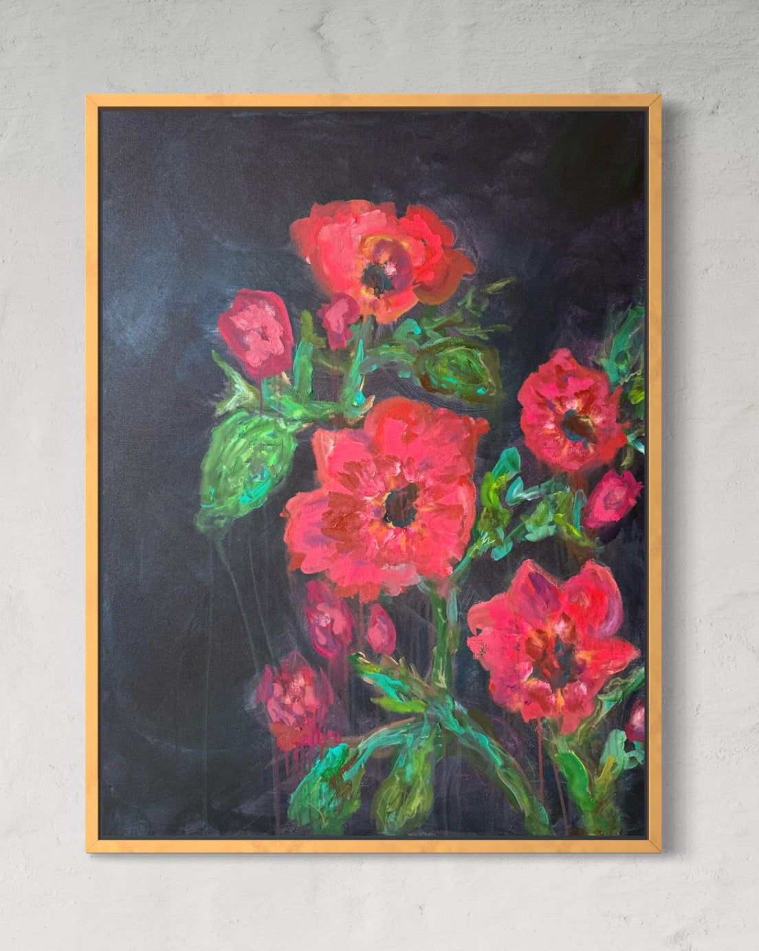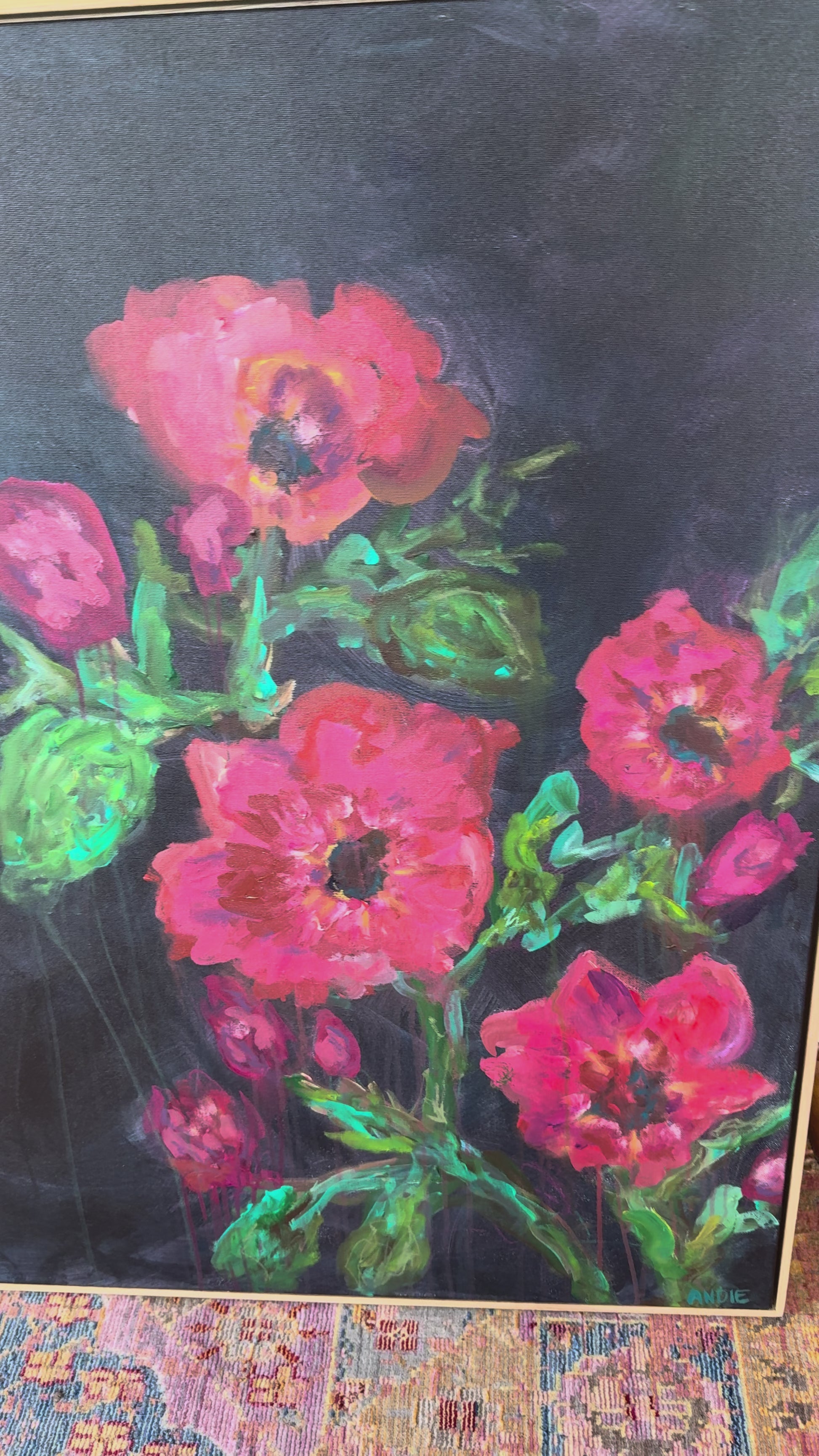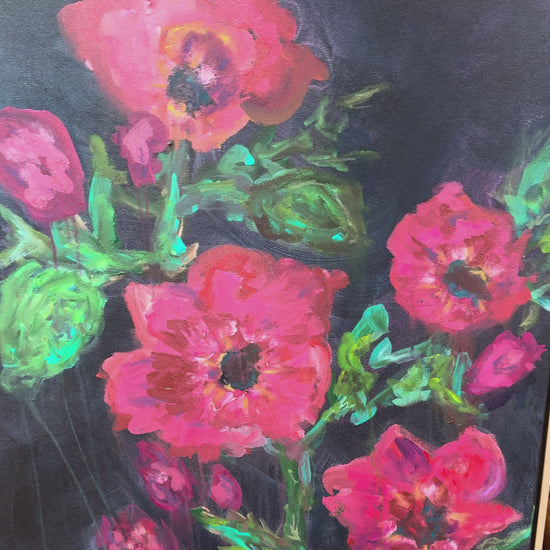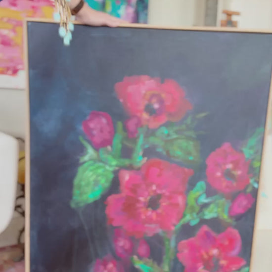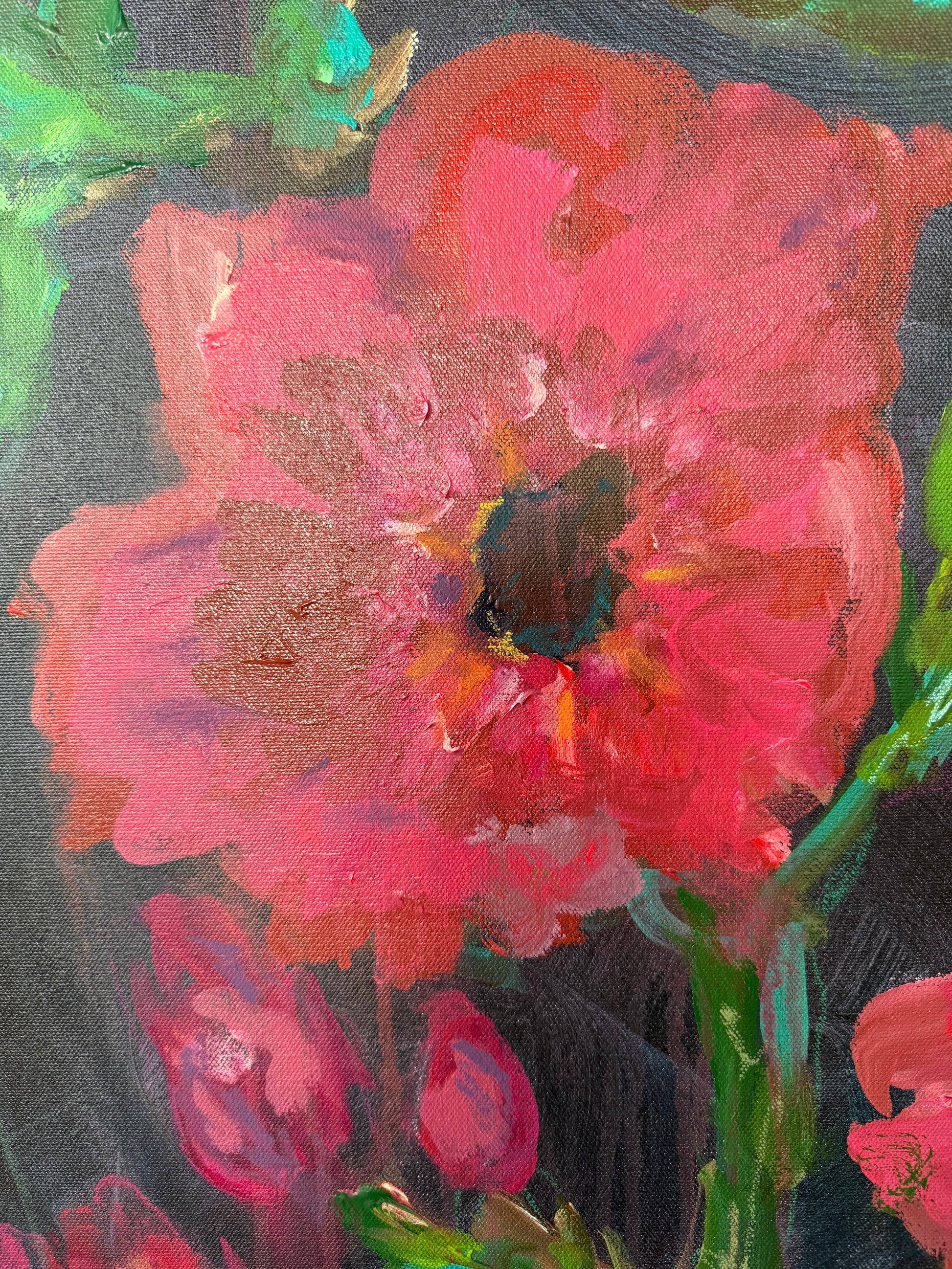 The Only One I Know is an expressive floral painting set against a deep, moody ground, where rich pink blooms emerge with quiet strength and presence. Layered brushwork and softened edges give the flowers a sense of movement and life, as though they are unfolding in their own time.
