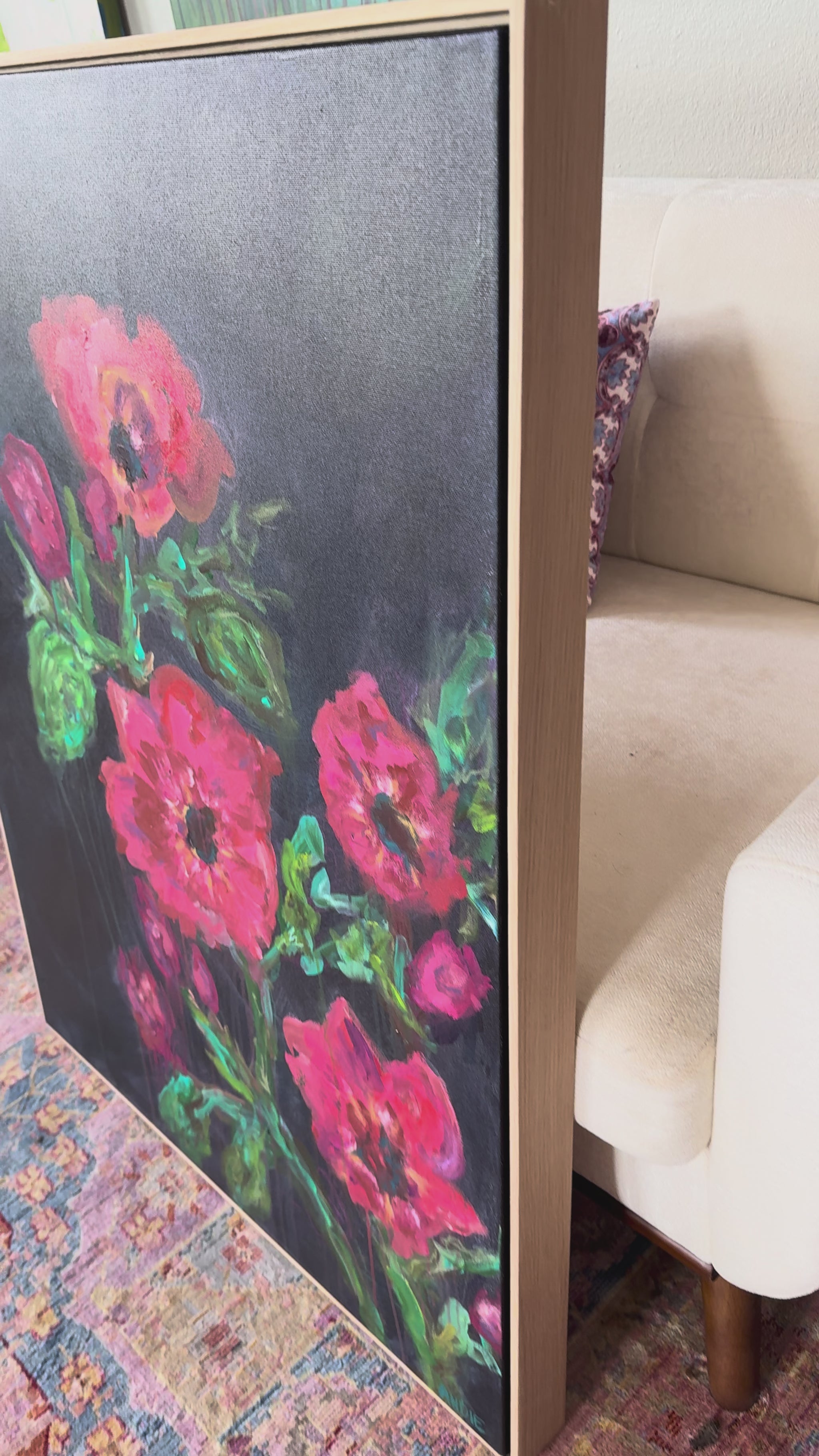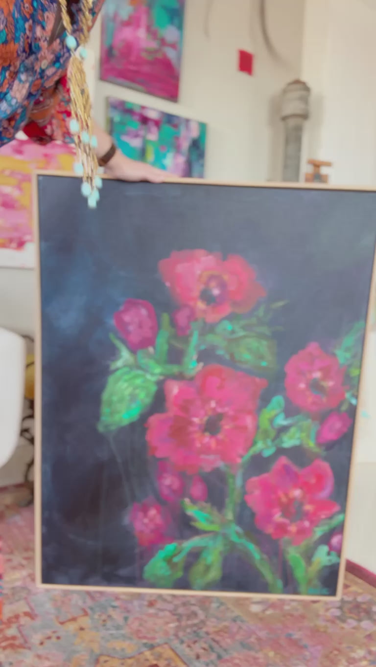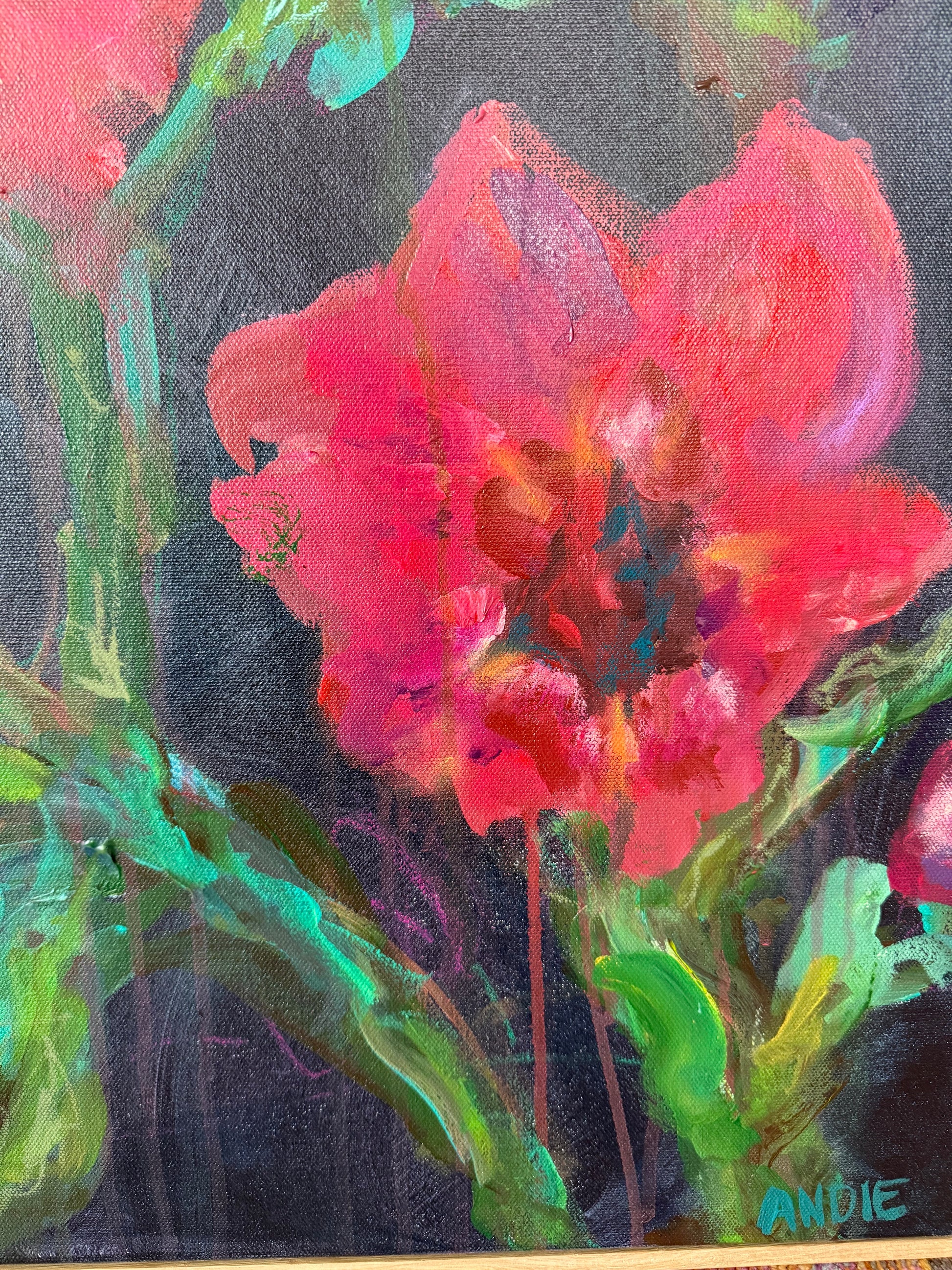 The Only One I Know is an expressive floral painting set against a deep, moody ground, where rich pink blooms emerge with quiet strength and presence. Layered brushwork and softened edges give the flowers a sense of movement and life, as though they are unfolding in their own time.