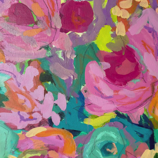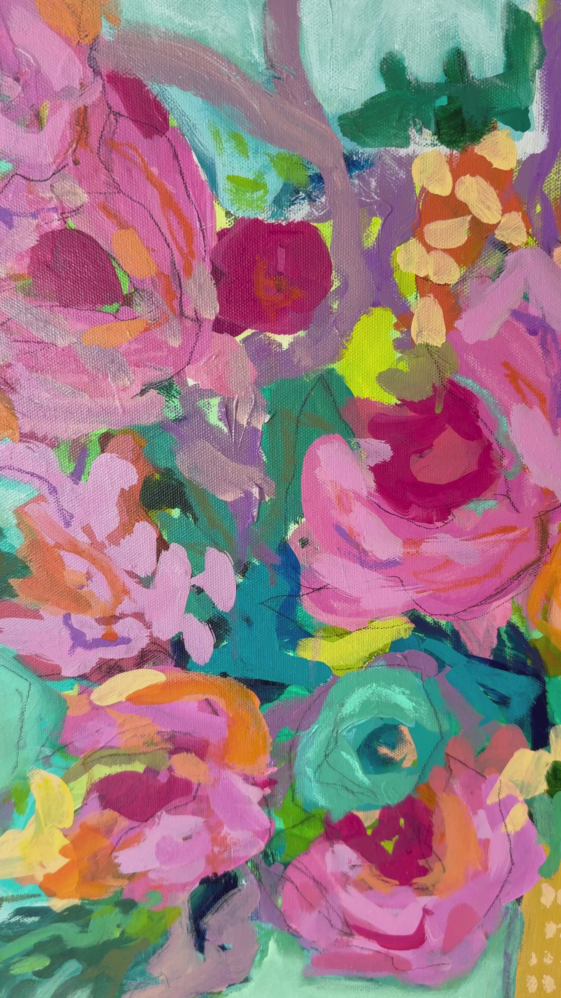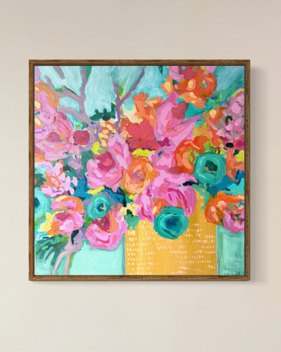 Bold, joyful, and unapologetically full of life—this painting is a love letter to color and connection. Bursting with vibrant pinks, fiery oranges, and deep teal blues, the bouquet feels alive, almost dancing off the canvas. It’s a playful celebration of devotion, beauty, and the kind of love that refuses to be quiet. Perfect for a statement wall, this piece brings warmth, charm, and a touch of whimsy to any space.
