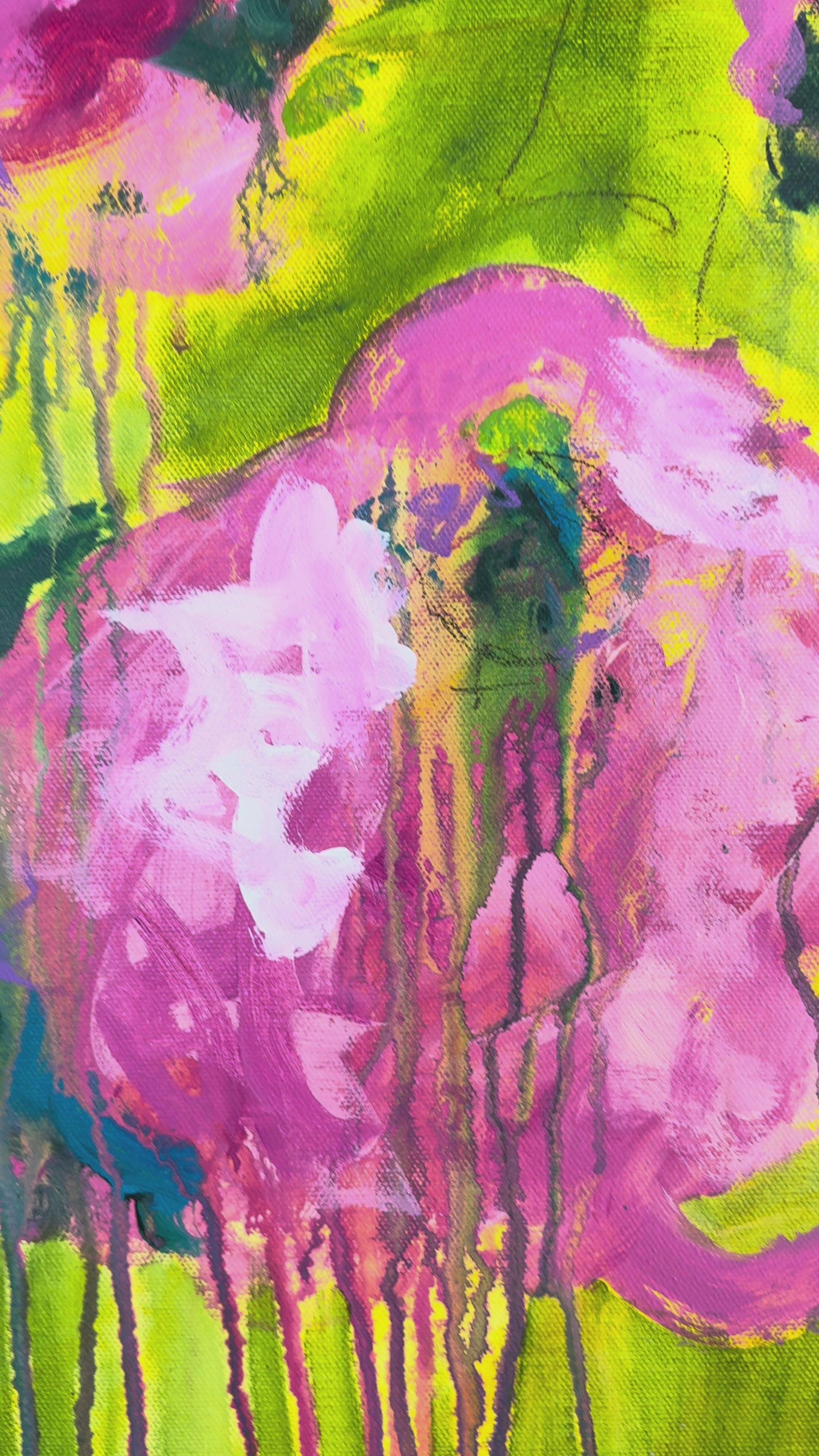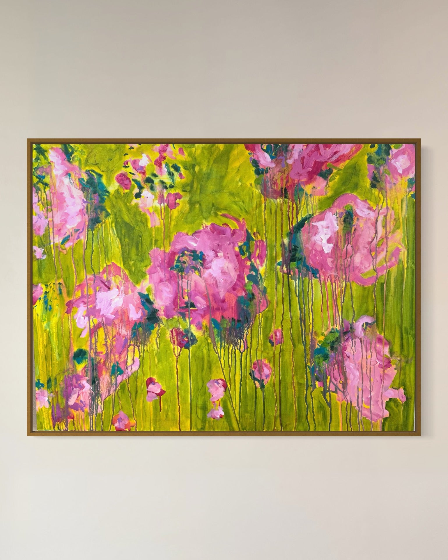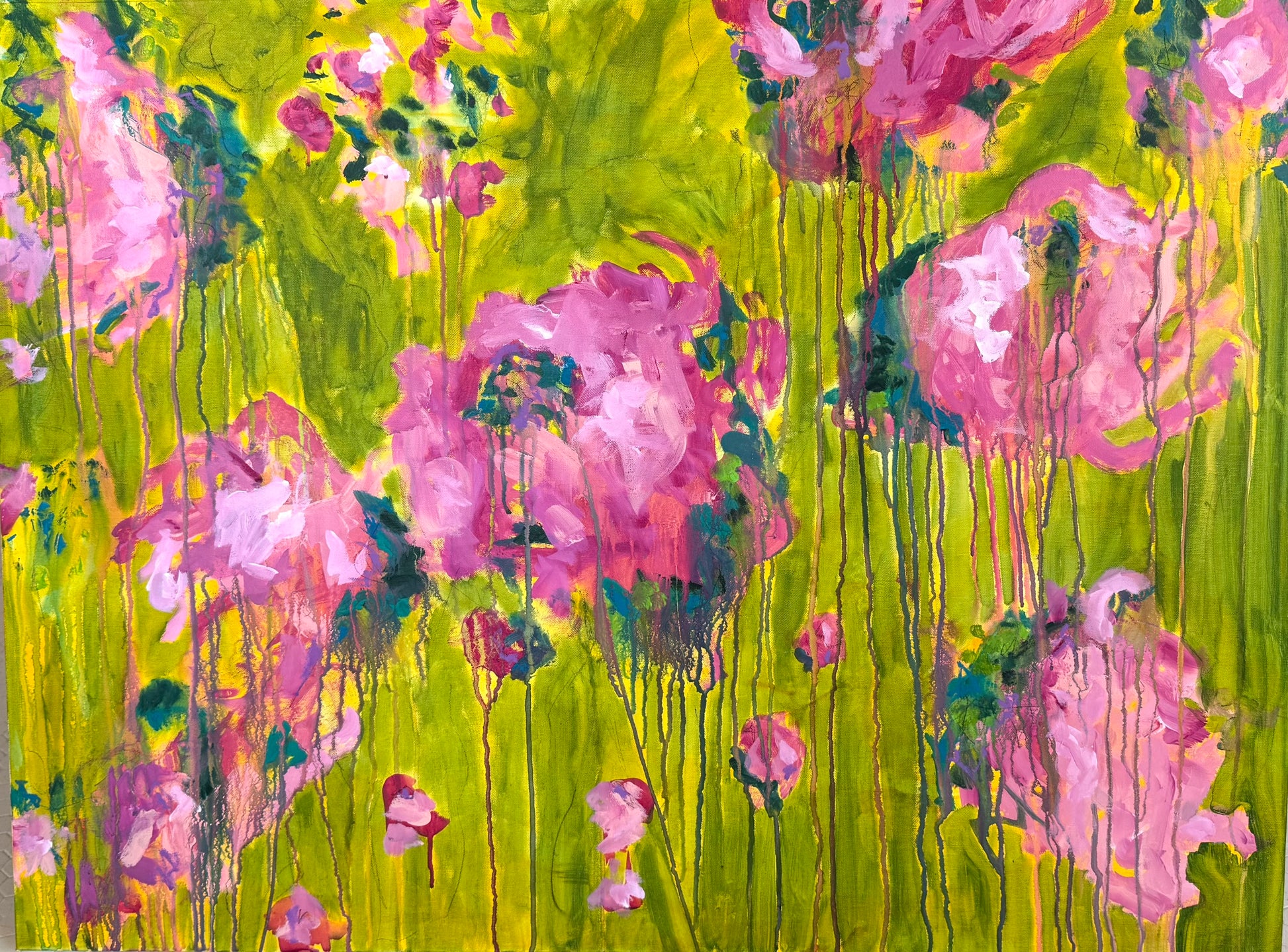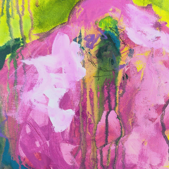 This painting is a burst of sunshine and wild blooms, inspired by Summertime from The Sundays. Loose pink florals spill across a backdrop of bright, lively green, with drips and layers that feel like petals caught in motion. It has that carefree, joy-soaked energy of summer, the kind of warmth that lingers long after the season ends.