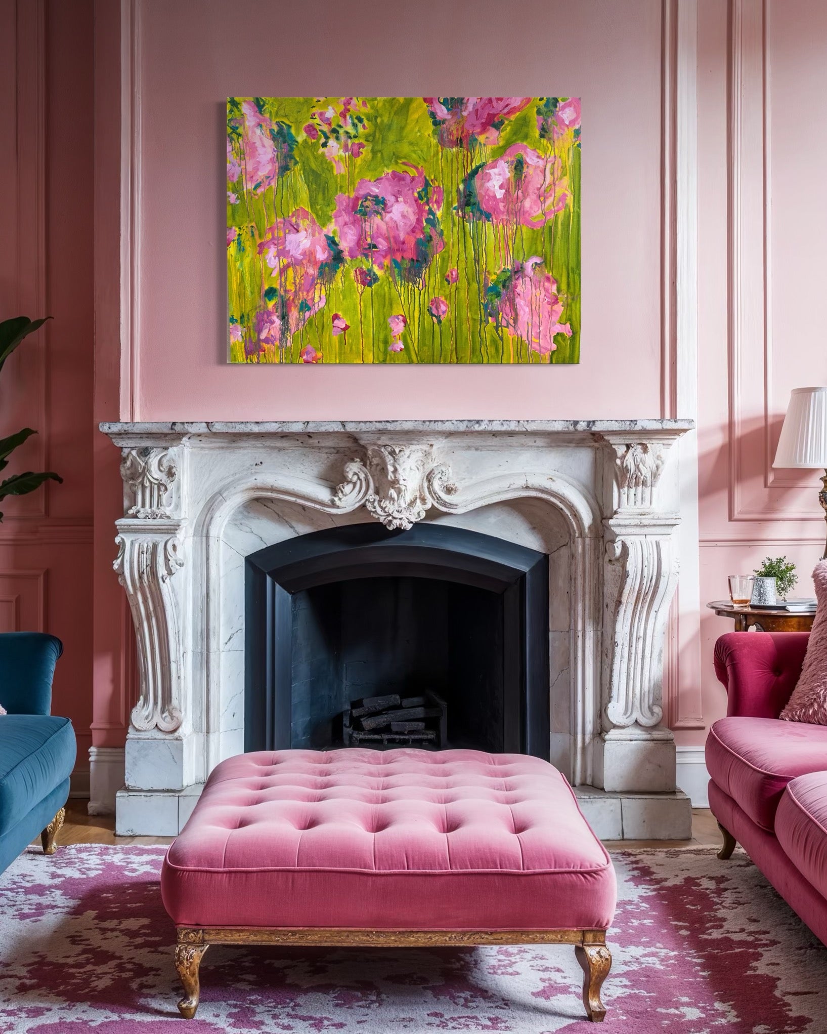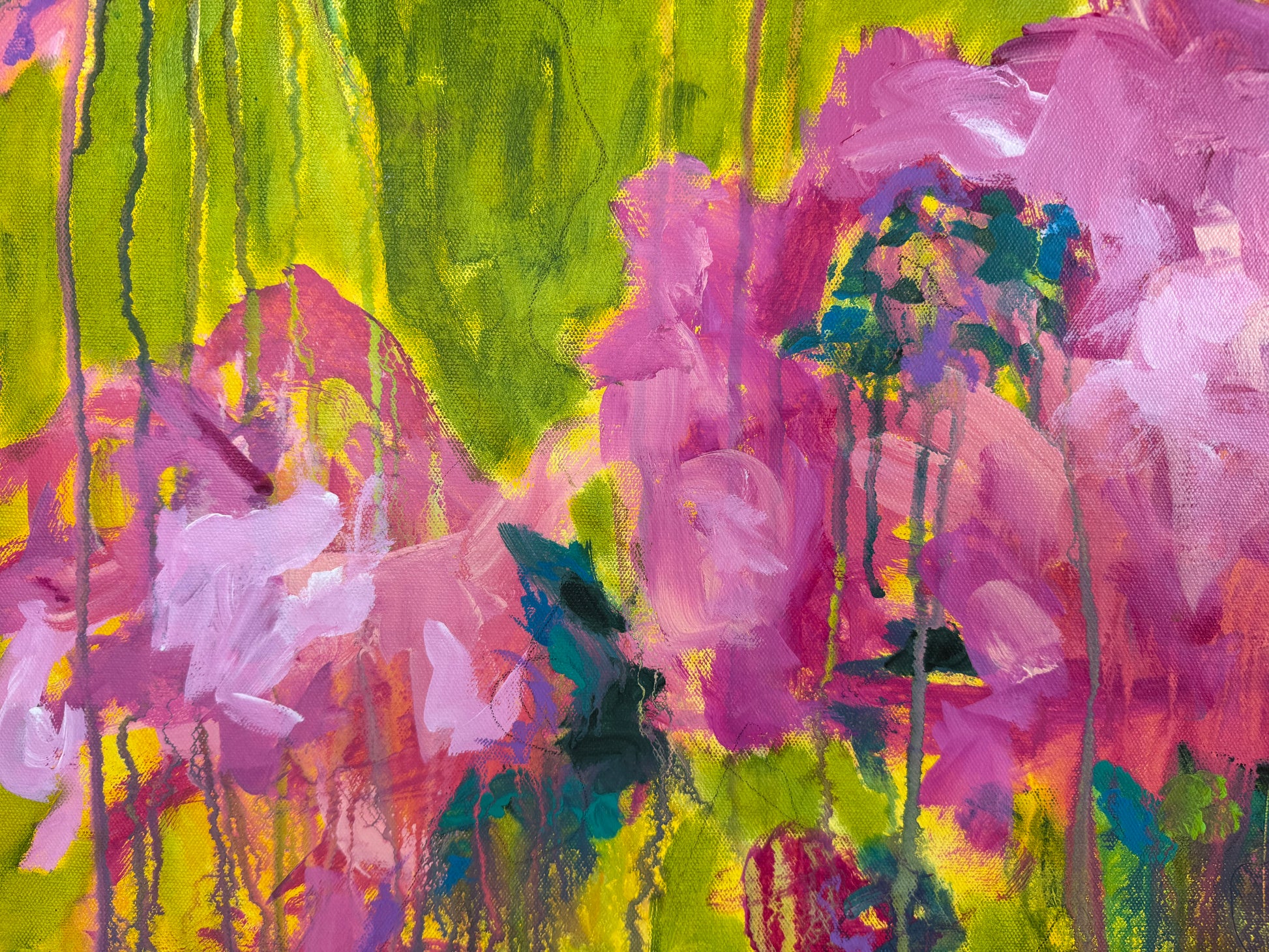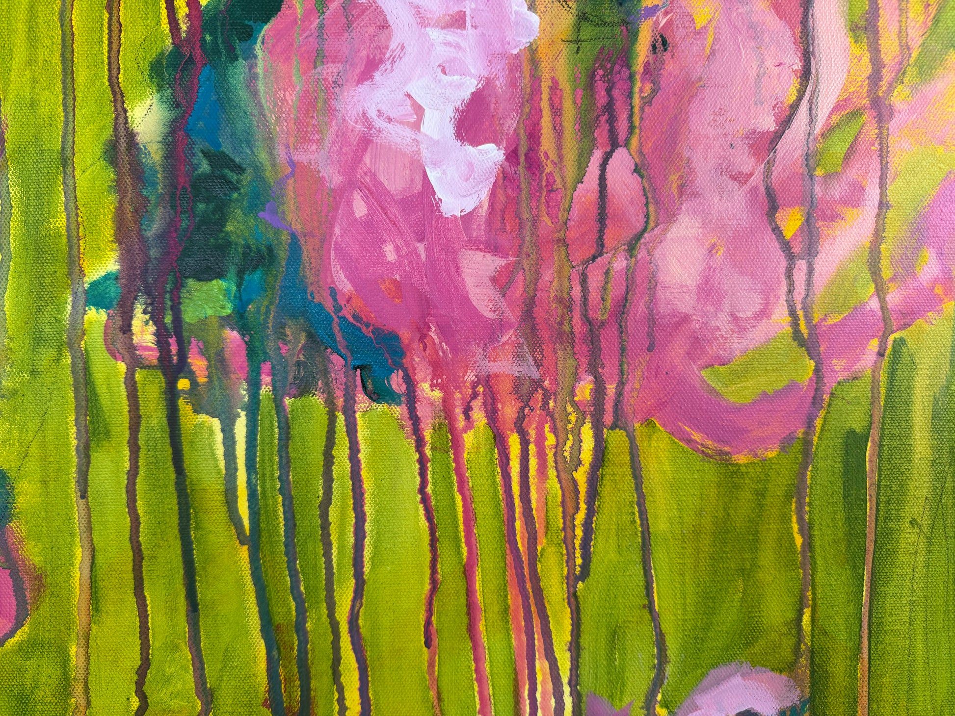 This painting is a burst of sunshine and wild blooms, inspired by Summertime from The Sundays. Loose pink florals spill across a backdrop of bright, lively green, with drips and layers that feel like petals caught in motion. It has that carefree, joy-soaked energy of summer, the kind of warmth that lingers long after the season ends.