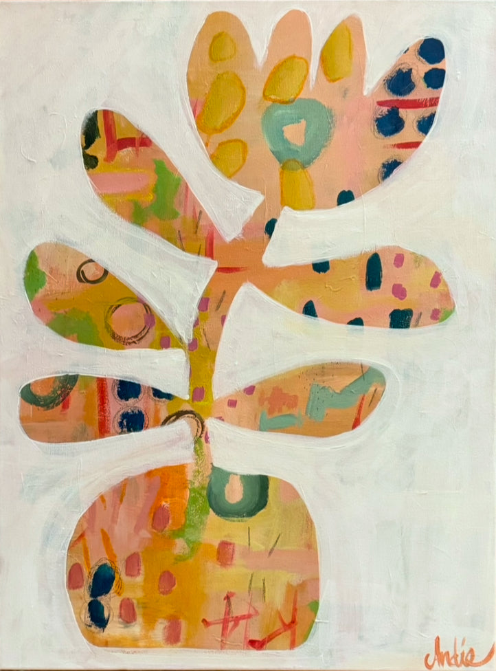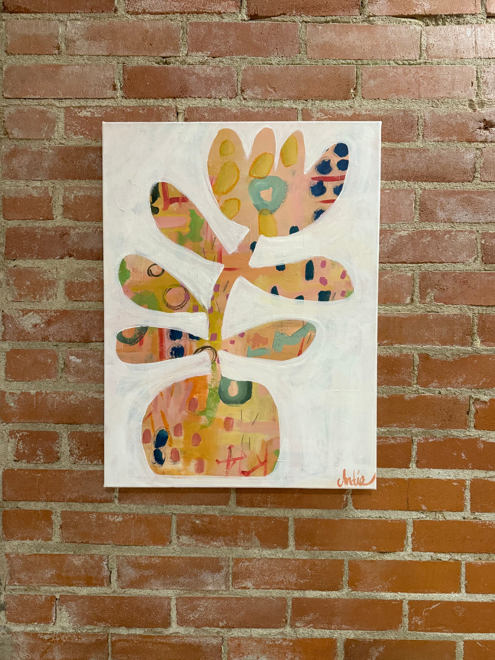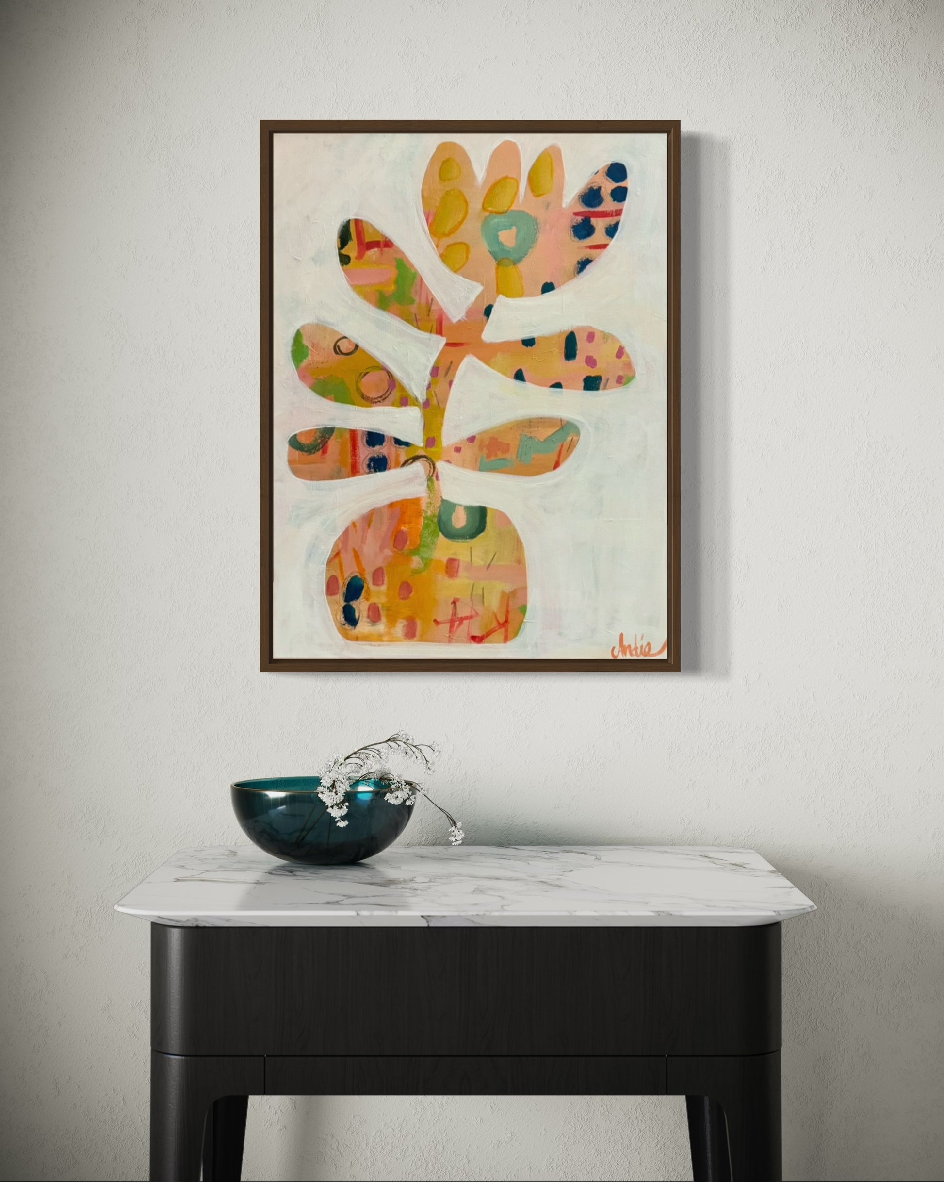 The Only One is a playful and modern abstract botanical, where vibrant patterns peek through a crisp white silhouette. Layers of coral, golden yellow, teal, and blush create a joyful energy, while hand-drawn marks add a sense of whimsy and movement. This one-of-a-kind piece celebrates individuality—just like the plant that thrives in its own unique way. Perfect for brightening a gallery wall or adding a pop of personality to your home or office.