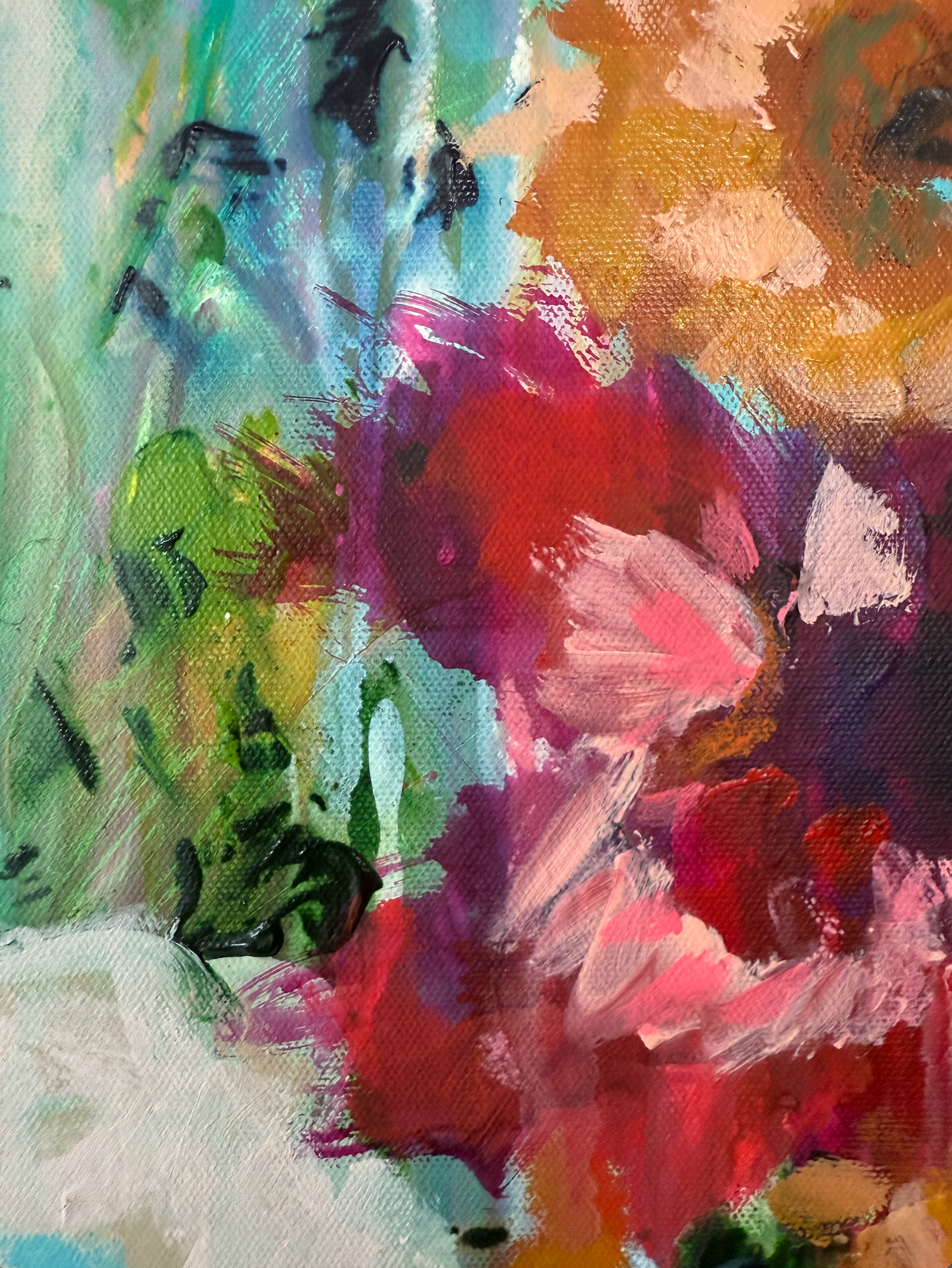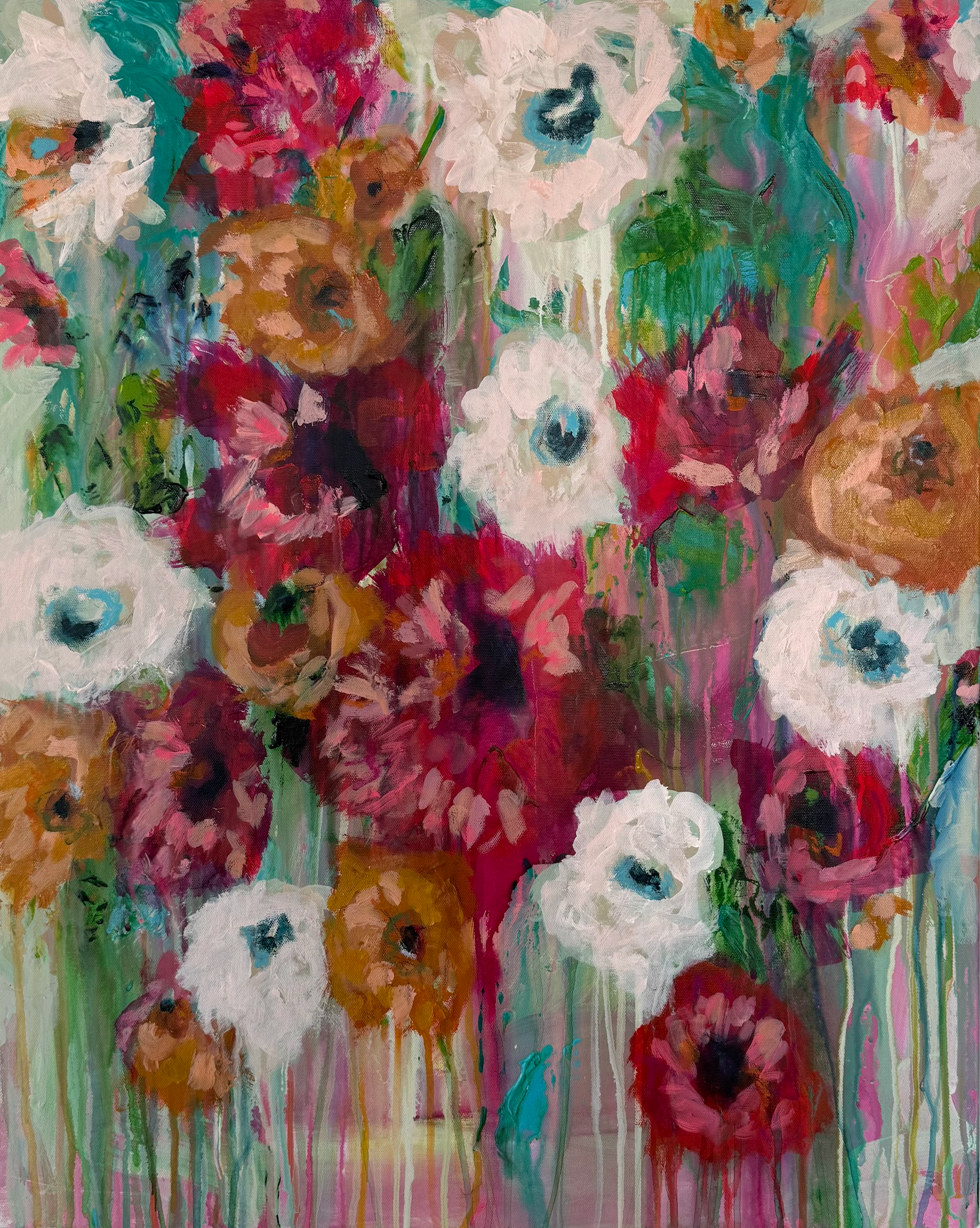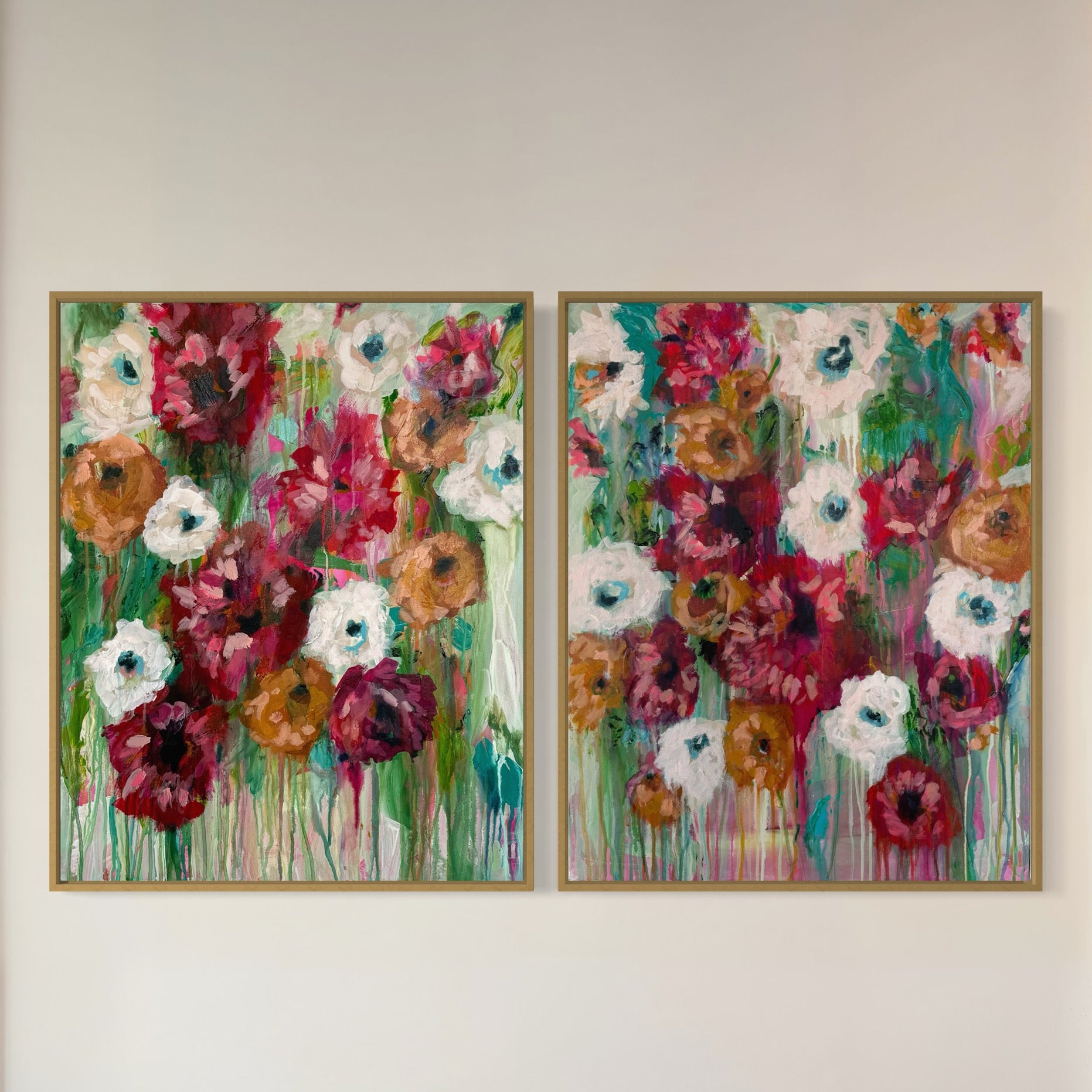 Radiating joy and warmth, What the World Needs Now and Love Sweet Love are vibrant floral abstracts that celebrate beauty, hope, and connection. Lush blooms in rich reds, warm golds, soft whites, and pinks seem to dance across a dreamy green and teal background, with expressive drips and layered brushstrokes adding movement and depth.