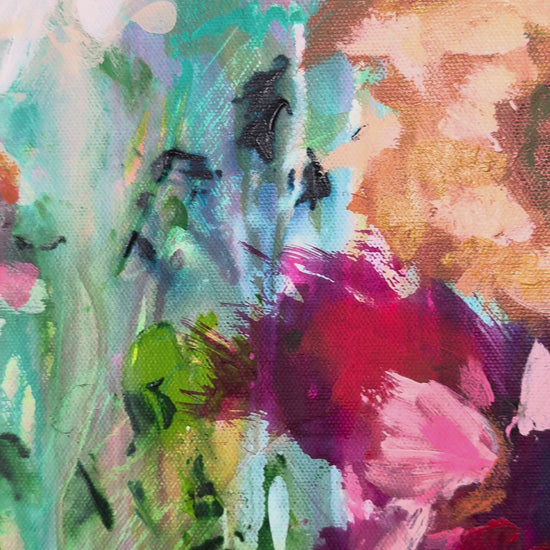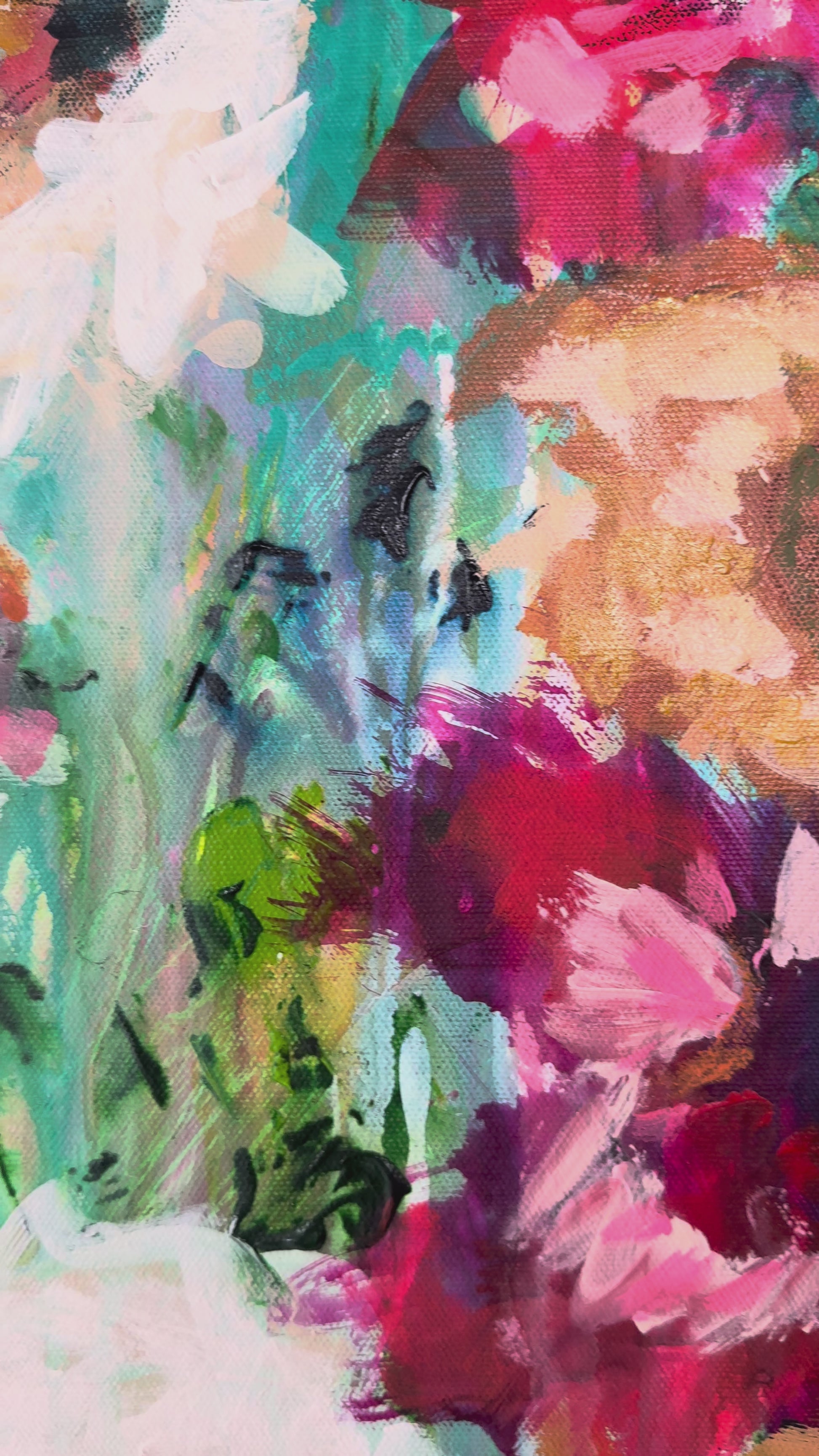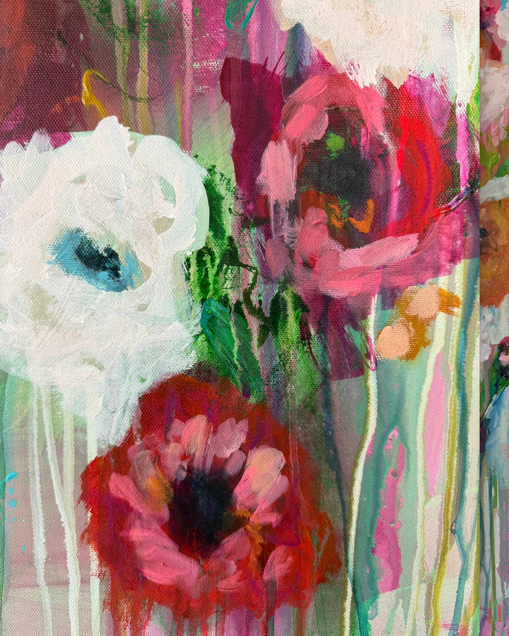 Radiating joy and warmth, What the World Needs Now and Love Sweet Love are vibrant floral abstracts that celebrate beauty, hope, and connection. Lush blooms in rich reds, warm golds, soft whites, and pinks seem to dance across a dreamy green and teal background, with expressive drips and layered brushstrokes adding movement and depth.